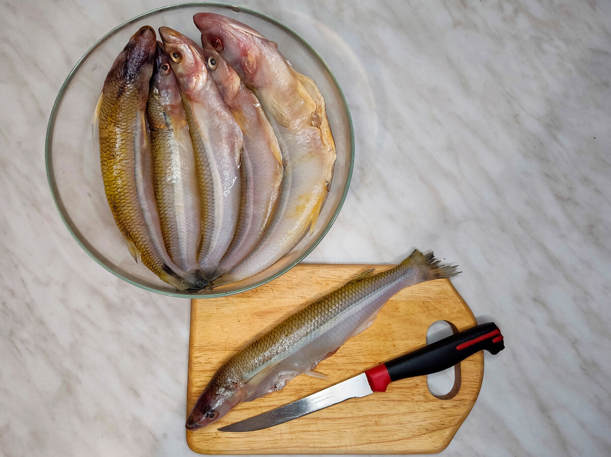 Сега дано поработим с корюшката. Внимателно отделете филето на корюшката от костите. Не изхвърляйте костите, главите и перките на рибите.