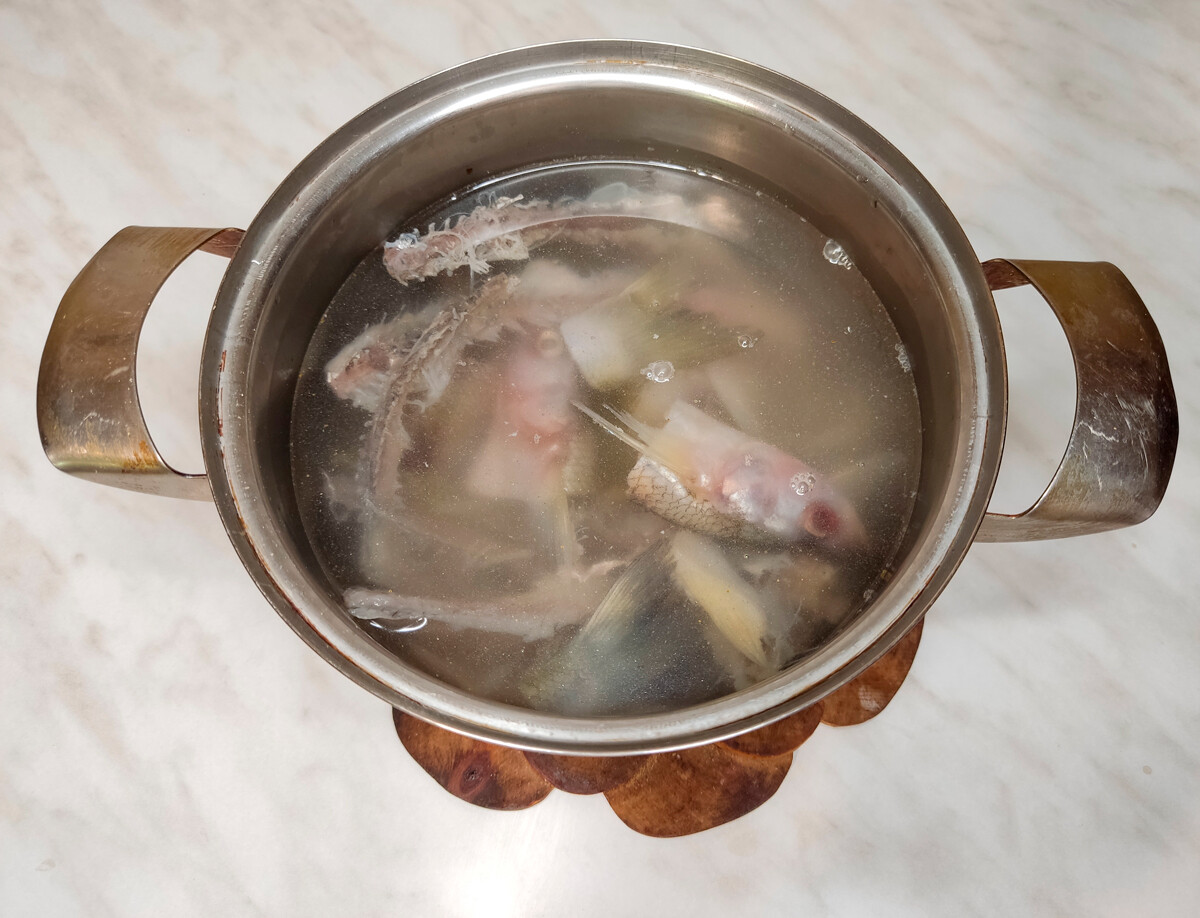 Повдигнете плика над тенджерата и го оставете да се отцеди добре, след което още веднъж поставете прясна порция риба (увита) в тенджерата. Гответе 30-40 минути, след което повторете процедурата с останалата част от рибата. Добавете една цяла глава лук, сол, черен пипер. След като лукът и рибата са подготвени, извадете всичко от бульона.