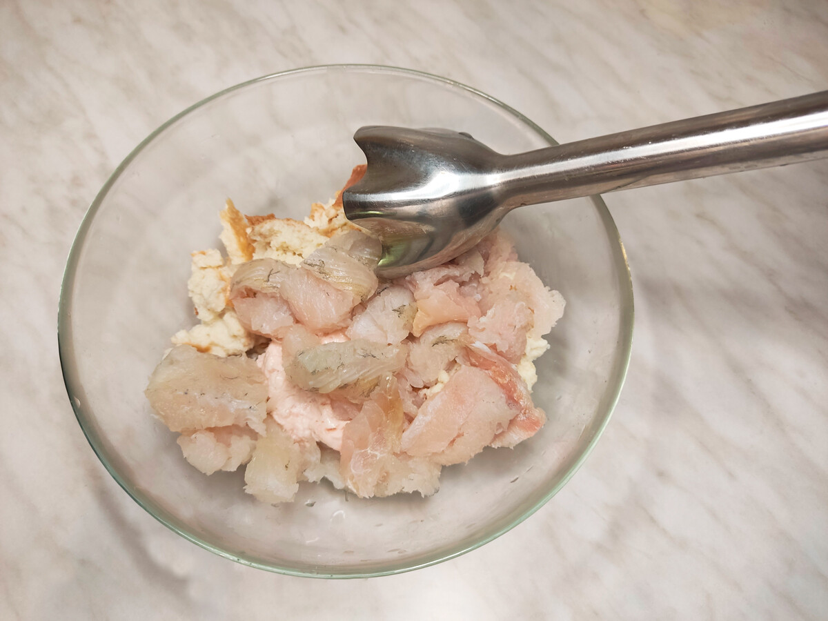 В обособена купа изсипете мляко върху няколко филийки хляб; щом омекне се прибавя към бялата риба. След това прибавете чаена лъжичка масло от раци, в случай че имате (или пропуснете това) и малко сол.