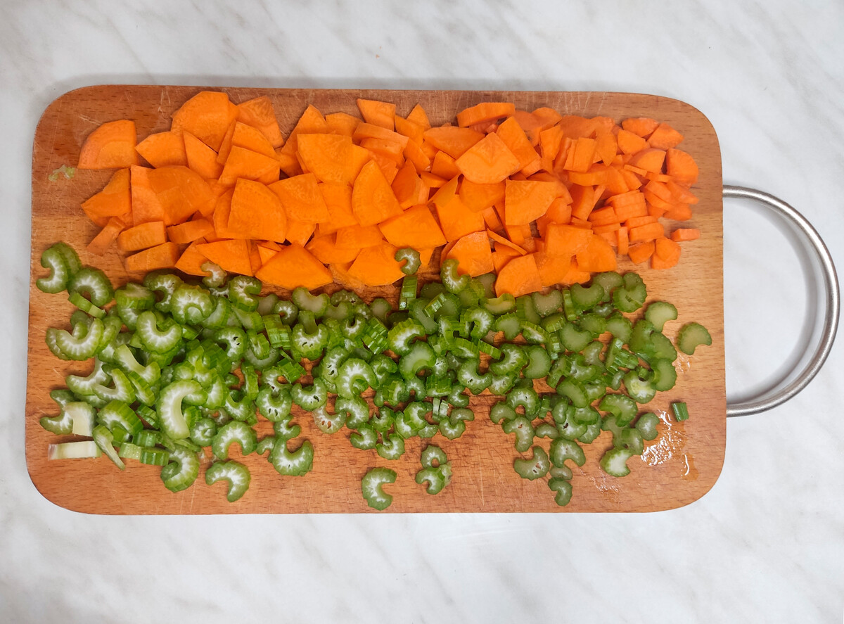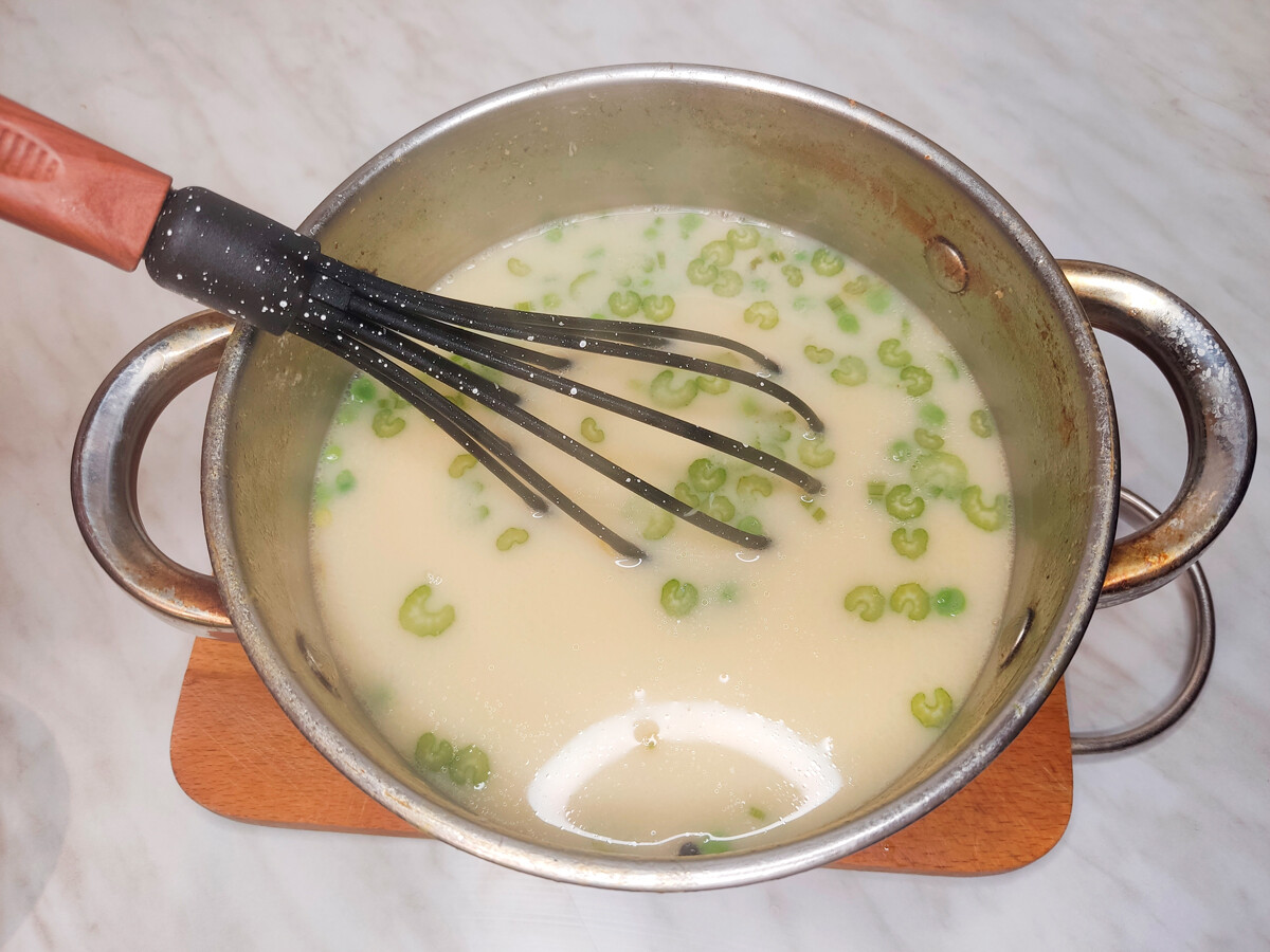 Нарежете морковите и целината, прибавете граха към супата и я оставете леко да заври.