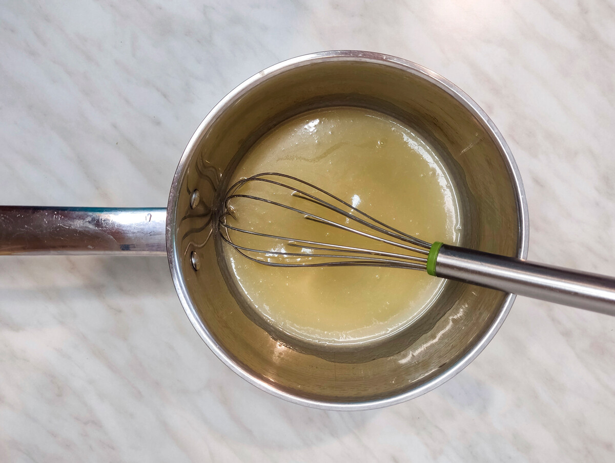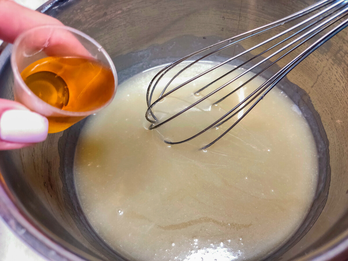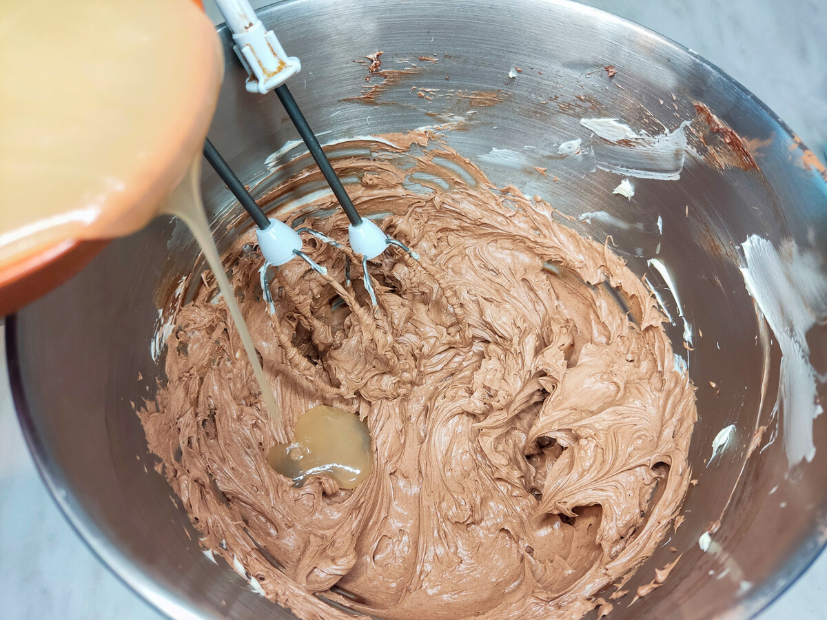След това, на дребни порции, прибавете сиропа от предходната стъпка към сместа с маслото, като бъркате с миксера.