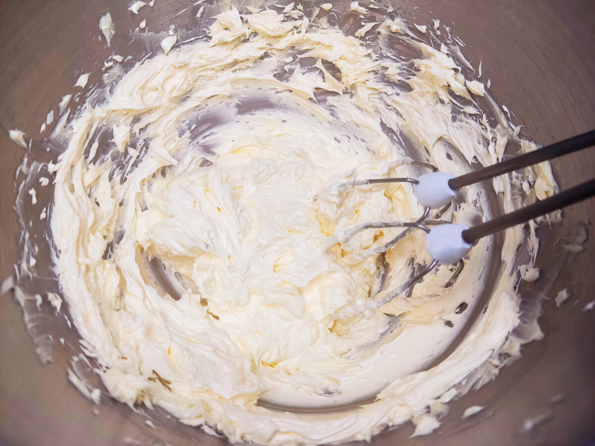 Извадете маслото от хладилника и го оставете да се стопли до стайна температура. Разбийте го с миксер на високи обороти за към 2-3 минути.