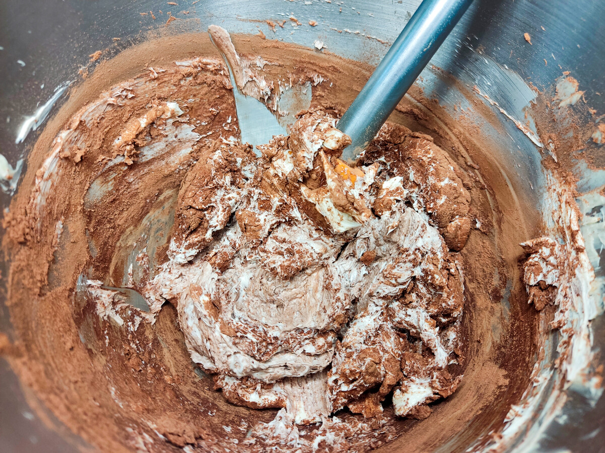 Пресейте какаото в сместа. Разбъркайте с шпатула, а по-късно и с миксер до приемане на гладка консистенция. Трябва да получите доста внимателен и апетитен шоколадов крем.