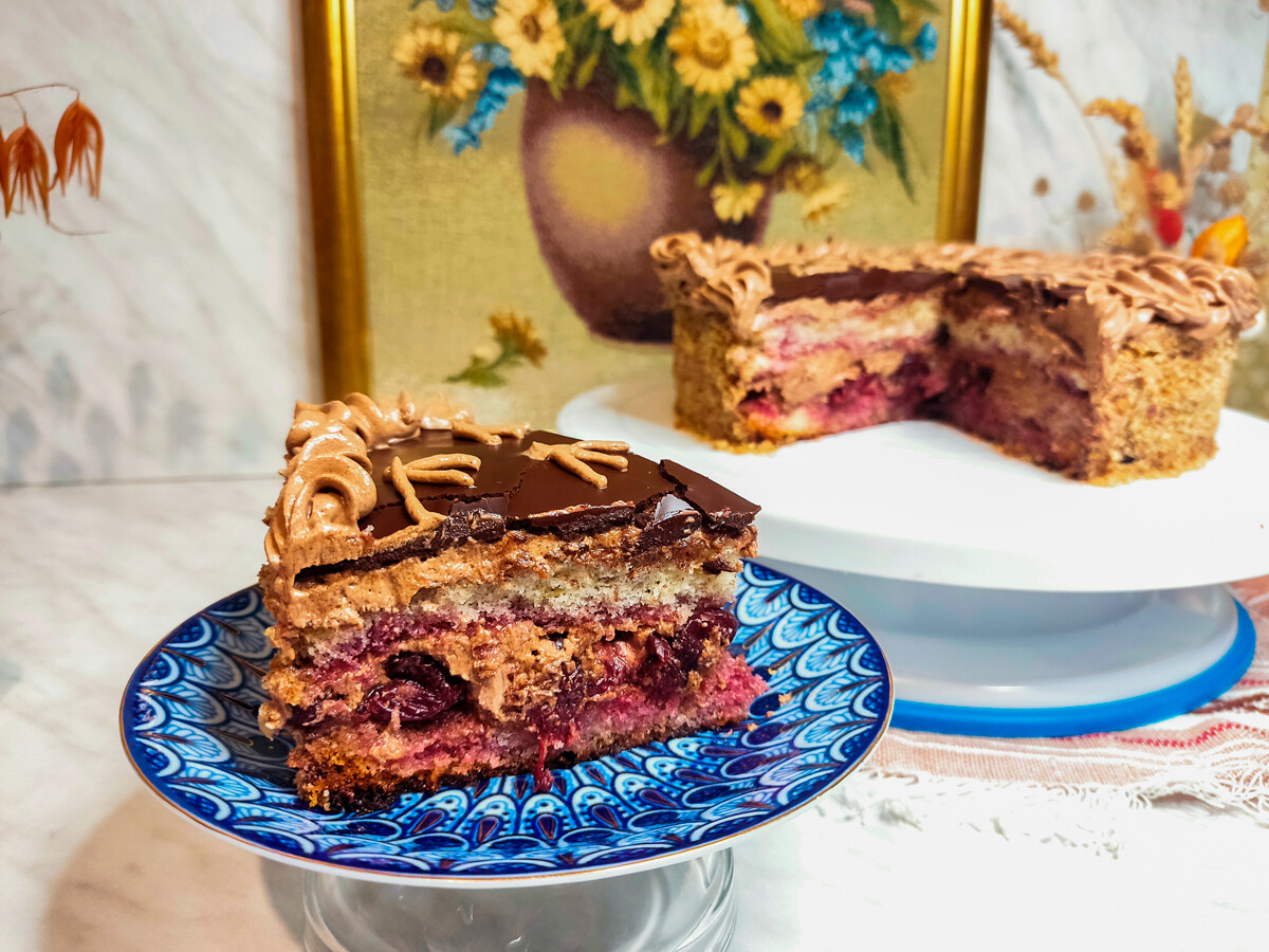Тази торта от руската кулинарна библиотека се състои от пандишпан, череши, накиснати в коняк, и внимателен шоколадов крем – необикновено вкусно!