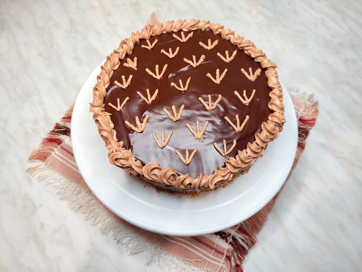 Останалия крем сложете в пулверизатор и украсете тортата по краищата. Добавете и следите от „ гъшите крайници “. Тортата би трябвало да се охлади за още 20 минути.