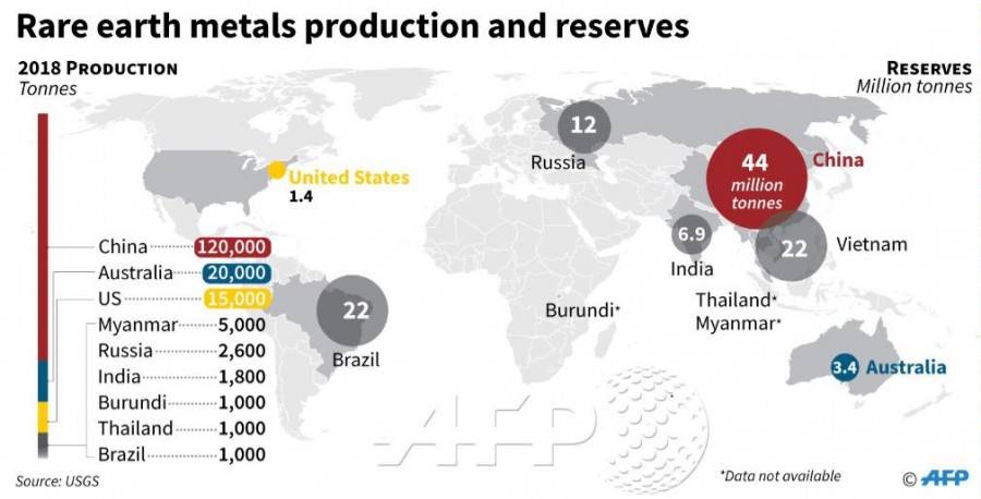 Въпреки господството си над доставките, Китай не е единствената страна със обилни ресурси от тези първични материали. Геоложко изследване на Съединени американски щати оцени предходната година, че са налице 120 млн. тона ресурси по света, в това число 44 млн. тона в Китай и 22 млн. тона в Бразилия и Виетнам.