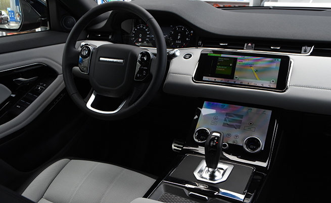 Интериорът на Evoque е по едно и също време съвременен и доста изчистен. Централно място (по сходство на Velar) заемат двата 10-инчови сензорни екрана на информационно-развлекателна система Touch Pro Duo. Когато стартирате мотора, горният екран се повдига на 30 градуса от хоризонталната си позиция, което дава на лидера доста по-добра видимост към него. Долният сензорен екран е вграден в централната подпора, като от него се ръководят функционалности като климатроника и Terrain Response 2. Двата сензорни екрана се допълват от два въртящи се контролера. Скоростният лост (от Jaguar F-Type) е страховит.