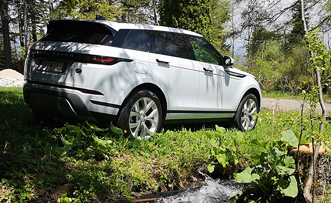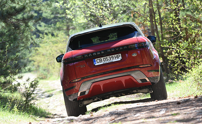 Само ще отбелязвам (все отново е Range Rover) високата проходимост на модела, въпреки да имам вяра, че и 1% от притежателите му няма да употребяват цялостния му офроуд потенциал. Но кредото на марката е, че и веднъж да се наложи, Evoque (и всеки различен модел на Range Rover) би трябвало да мине на всички места. За задачата той предлага ъгъл на заход и отход от надлежно 25 и 30,6 (най-голям в сегмента) градуса, 212 мм пътен луфт, опция за прегазване във вода до 600 мм, Terrain Response 2 и режими на задвижване Comfort, Sand, Grass-Gravel-Snow и и Mud & Ruts.