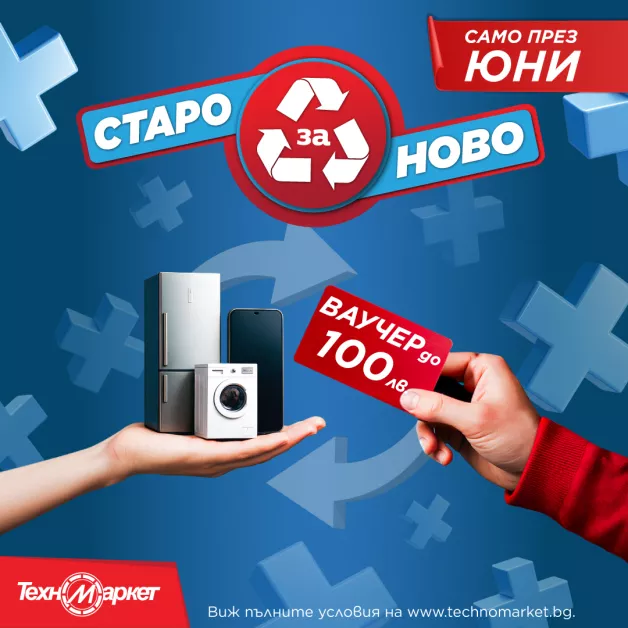 С акцията „ Старо за ново “, Техномаркет кани потребителите да се освободят от старите електроуреди и мобилни телефони, като в подмяна получат ваучери на стойност до 100 лева за покупка на нови, по-модерни, по-енергийно ефикасни и по-икономични уреди.