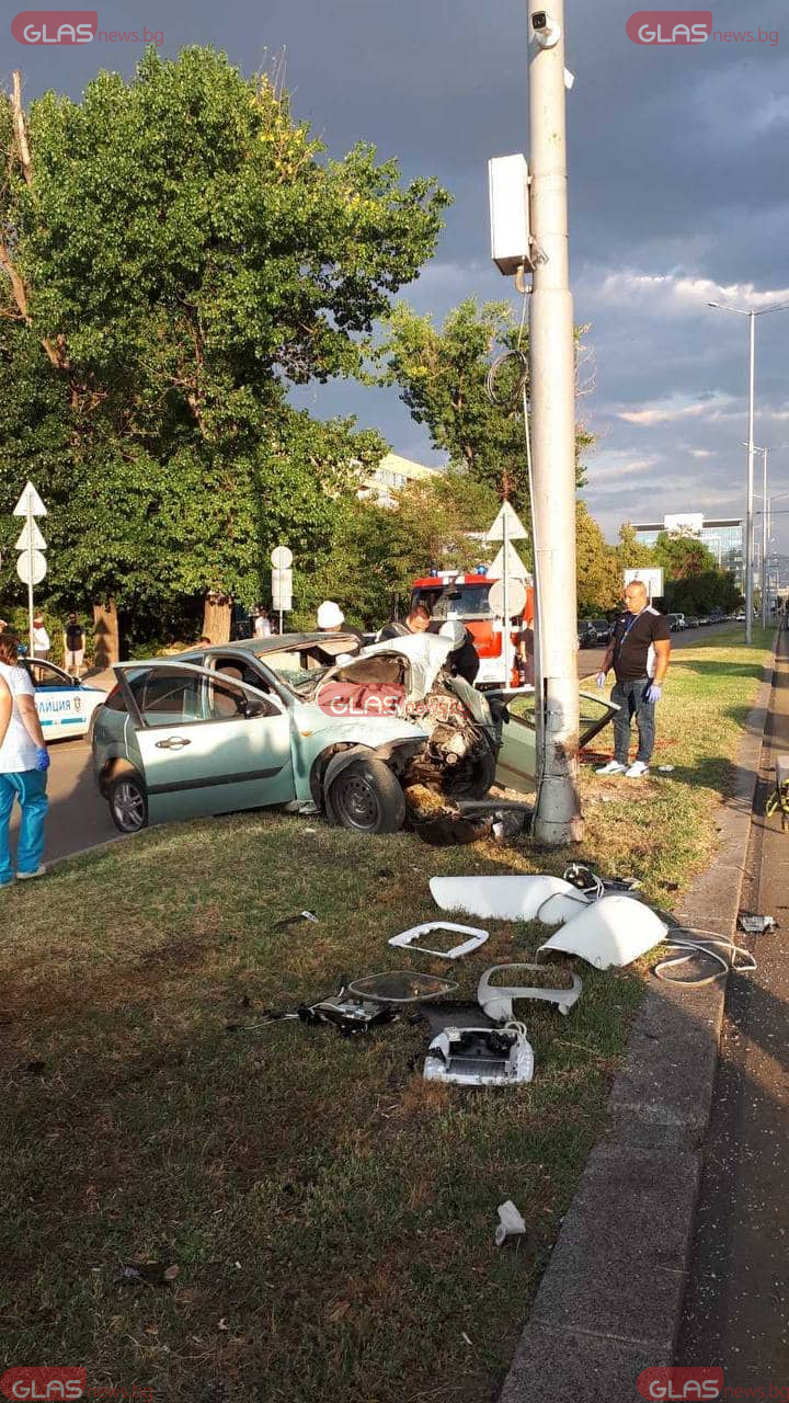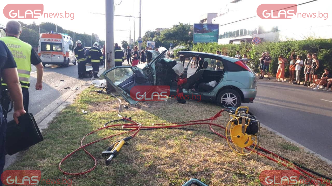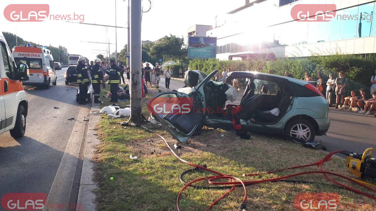 Предницата на автомобила е смачкана до неразбираемост. Наложило се е да режат ламарини, с цел да извадят хората. Колата се намира в тревните площи.