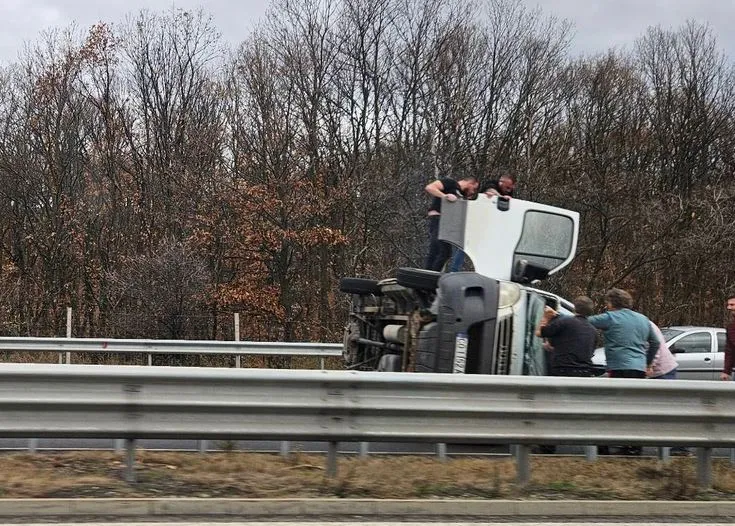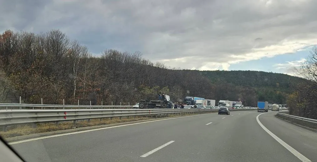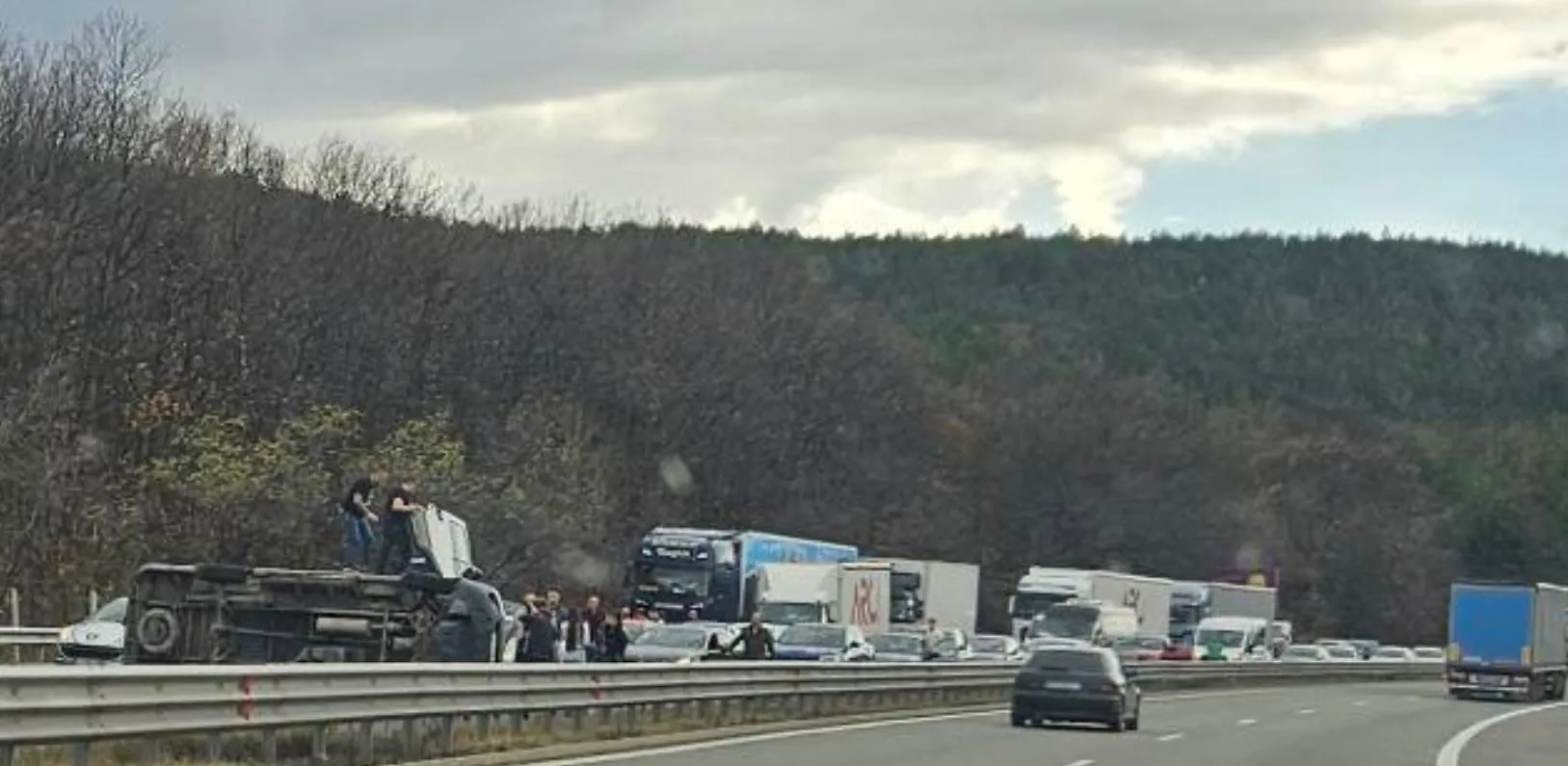 Бус се е обърнал в посока Пловдив, в региона на км 15. Машината е косо на платната, като е блокирала придвижването.