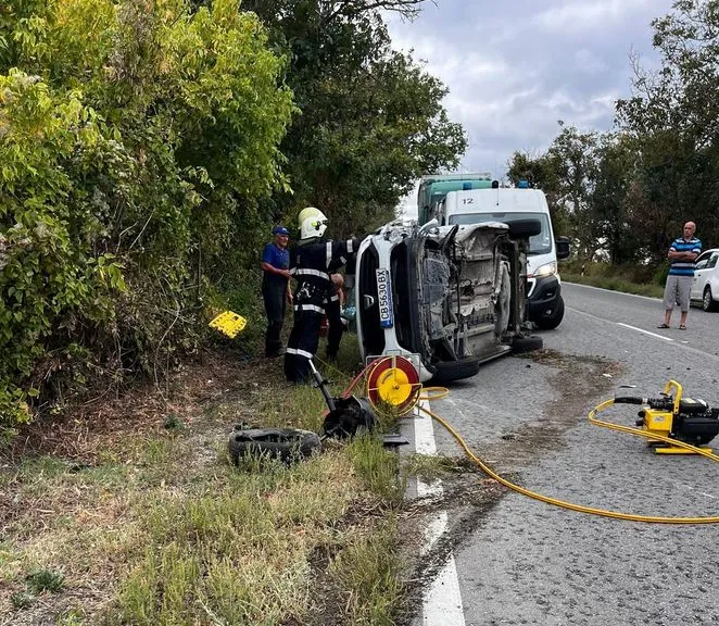 Лек автомобил се е обърнал на едната си страна, а камион е в канавката. Пристигнали са огнеборци и медици.