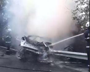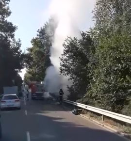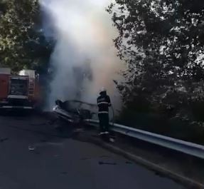 Пожарникари гасят пламната машина. От фрагменти, публикувани от пътуващи, се вижда, че тя е изгоряла изцяло.