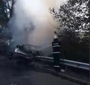 Кола се вряза в мантинела и изгоря СНИМКИ