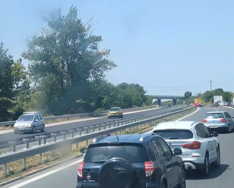 Движението е мощно затруднено и се е образувала запушалка. Движението се реализира единствено в спешната лента.