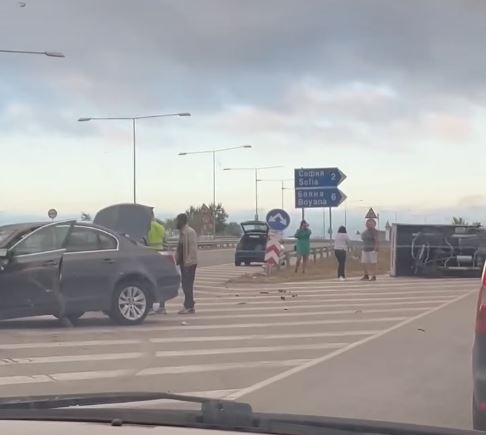 Бус е извърнат на една страна, а цялата предна част на лека кола е размазана. Произшествието е станало на отбивката за Банкя.