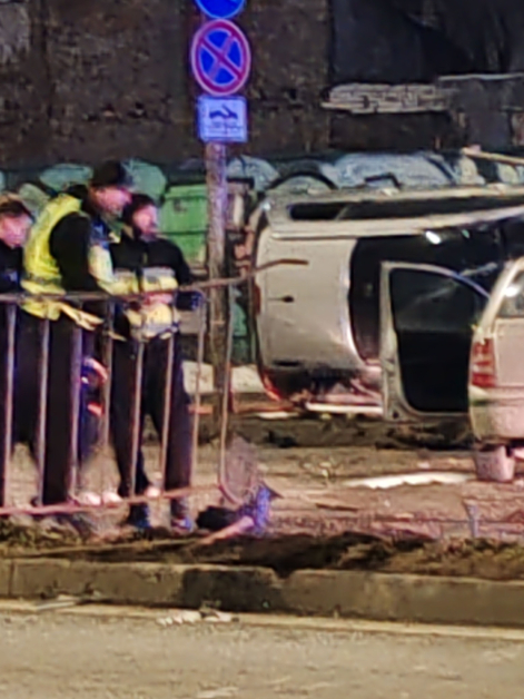 На фрагменти от мястото на случая се виждат два автомобила, единият от който е извърнат.