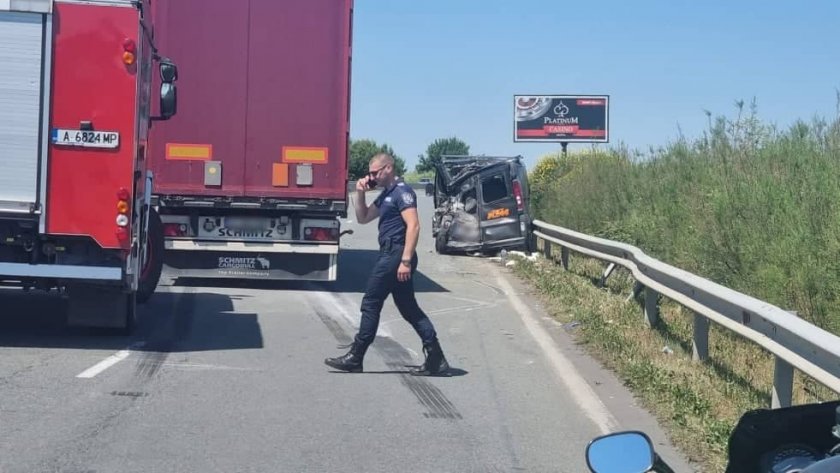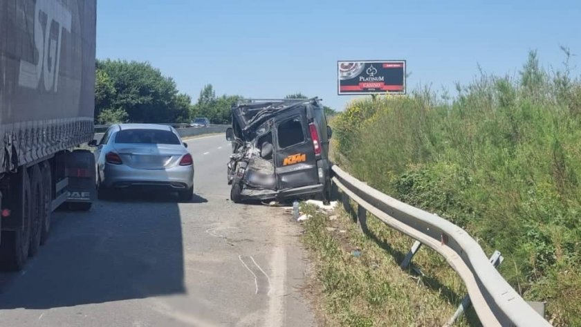Тежка злополука е станала на пътя Варна - Бургас, в региона на Поморие. Инцидентът се е случил малко след 10.00 часа. По първична информация тирът се е движил с висока скорост, застигайки буса, който се е движил пред него, врязвайки се в задната му част.