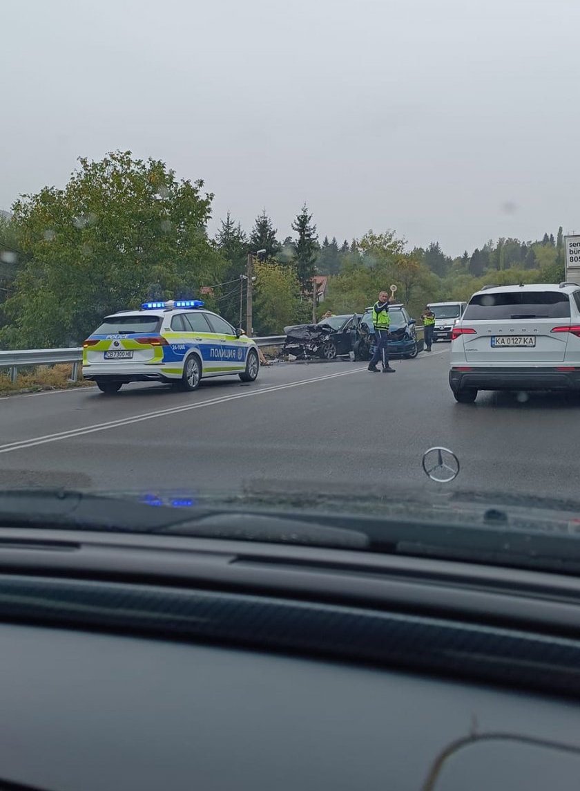Два автомобила са се блъснали челно на основната права наоколо до улица „ Калдъръмче “. Лентата за придвижване в посока София е изцяло блокирана, а колите тръгнали в противоположната посока едвам пъплят.