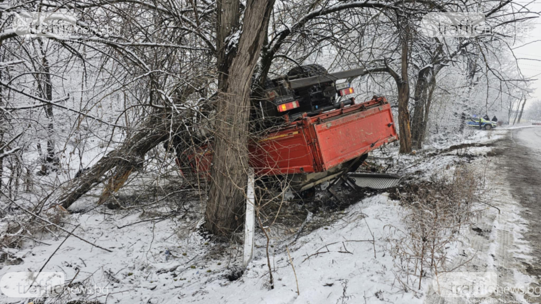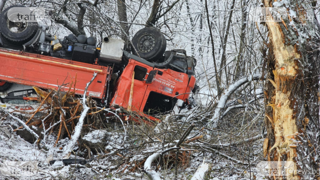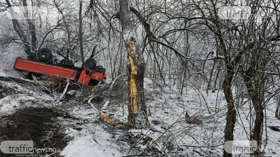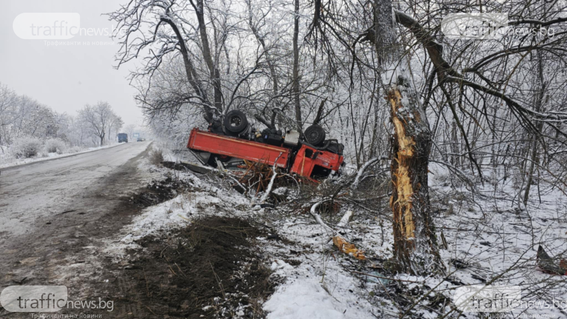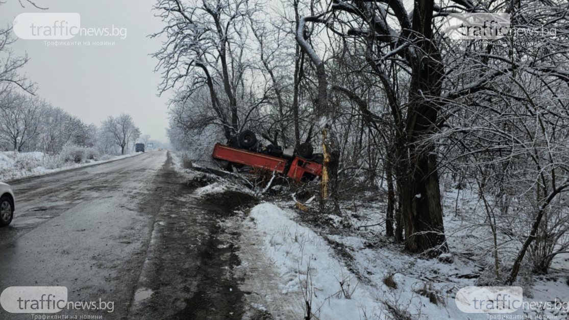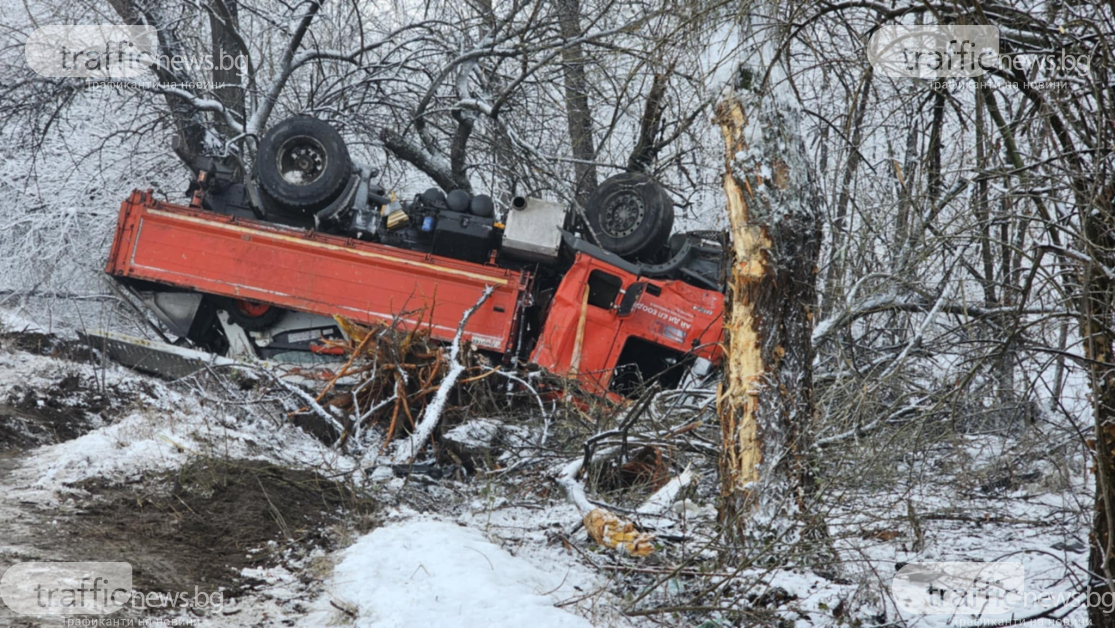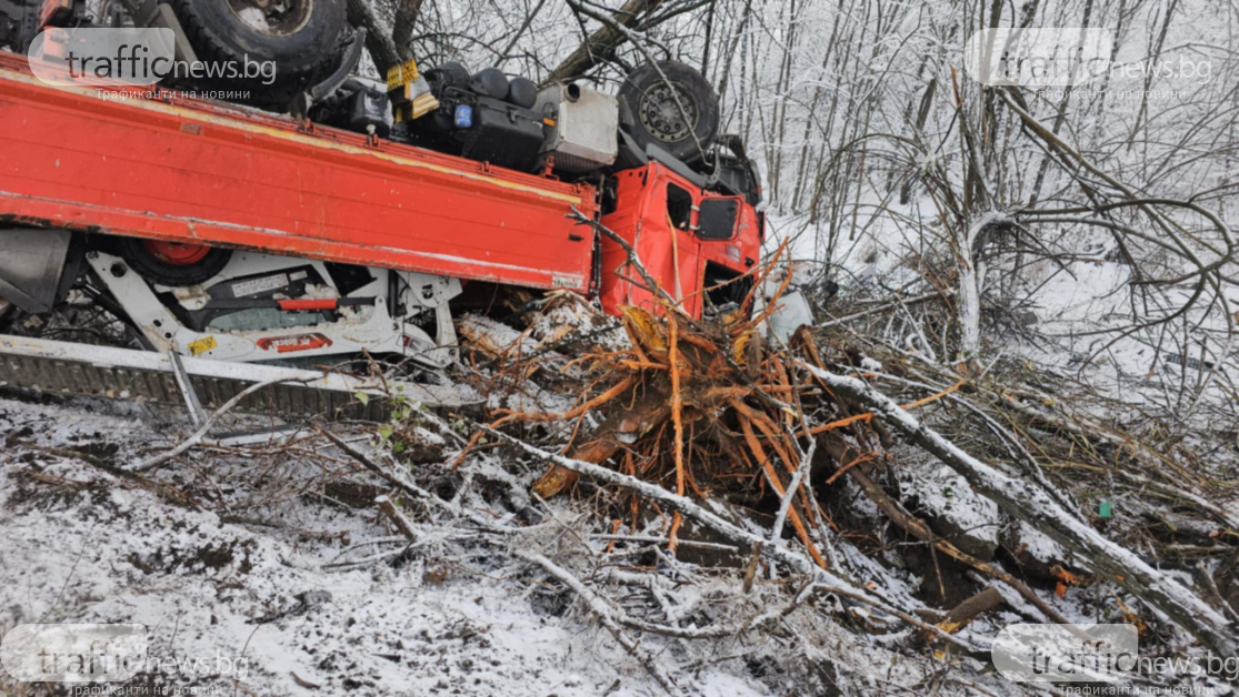 Тежка катастрофа на изхода на Пловдив! Камион изкорени дърво и се преобърна по таван СНИМКИ