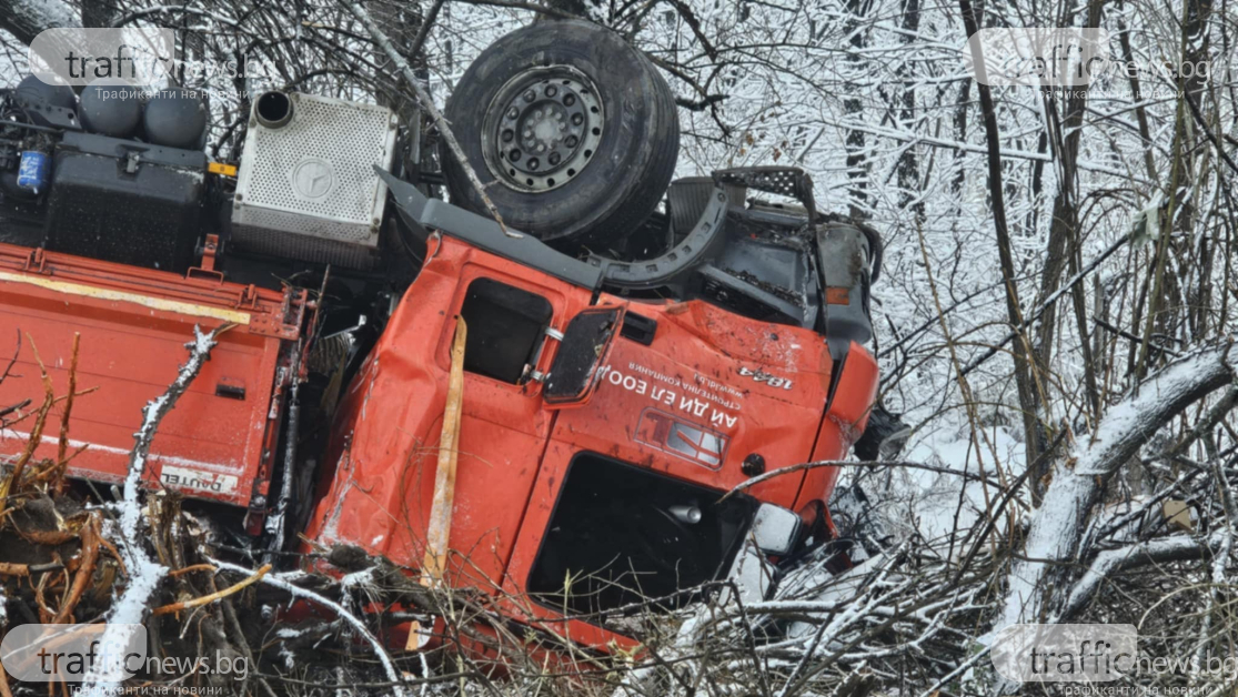 На камиона има натоварена машина за разчистване, като към този миг не е ясно дали е към някое от общинските предприятия за поддържане на пътната инфраструктура. Шофьорът е с пострадвания, само че е бил в схващане, когато е откаран с кола за спешна помощ към болница за прегледи.