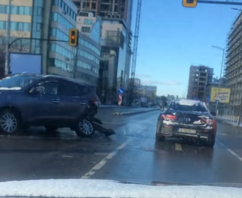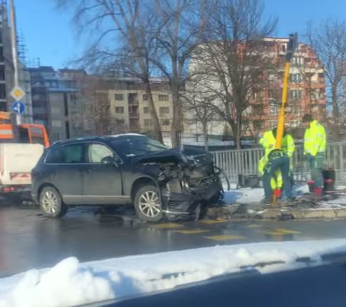 Две коли са се сблъскали на бул. " Тодор Александров ", а материалните вреди са обилни. Джип е с помляна предна част и отворени въздушни възглавници, а друга машина е с потрошена задна част. След удара е бил ударен и крайпътен дирек.