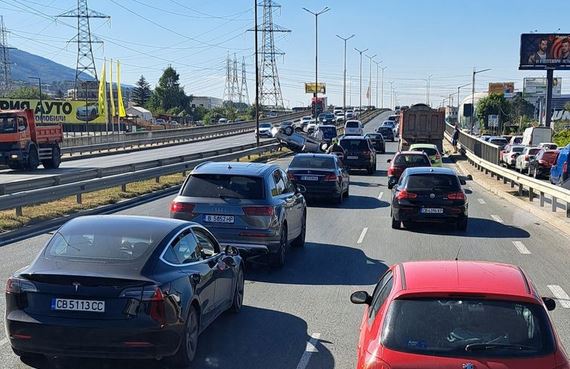 Лекият автомобил се е обърнал в лявата лента. Към момента не е известно дали става въпрос за конфликт с друго МПС, или лидерът е самокатастрофирал.
