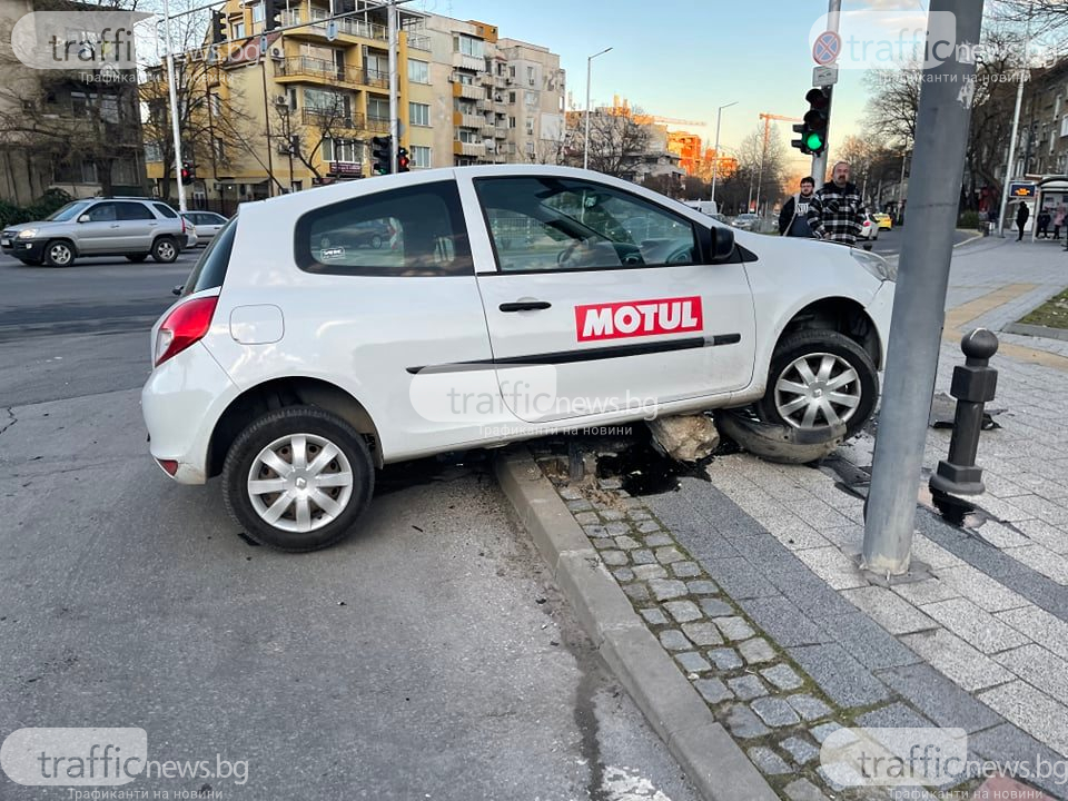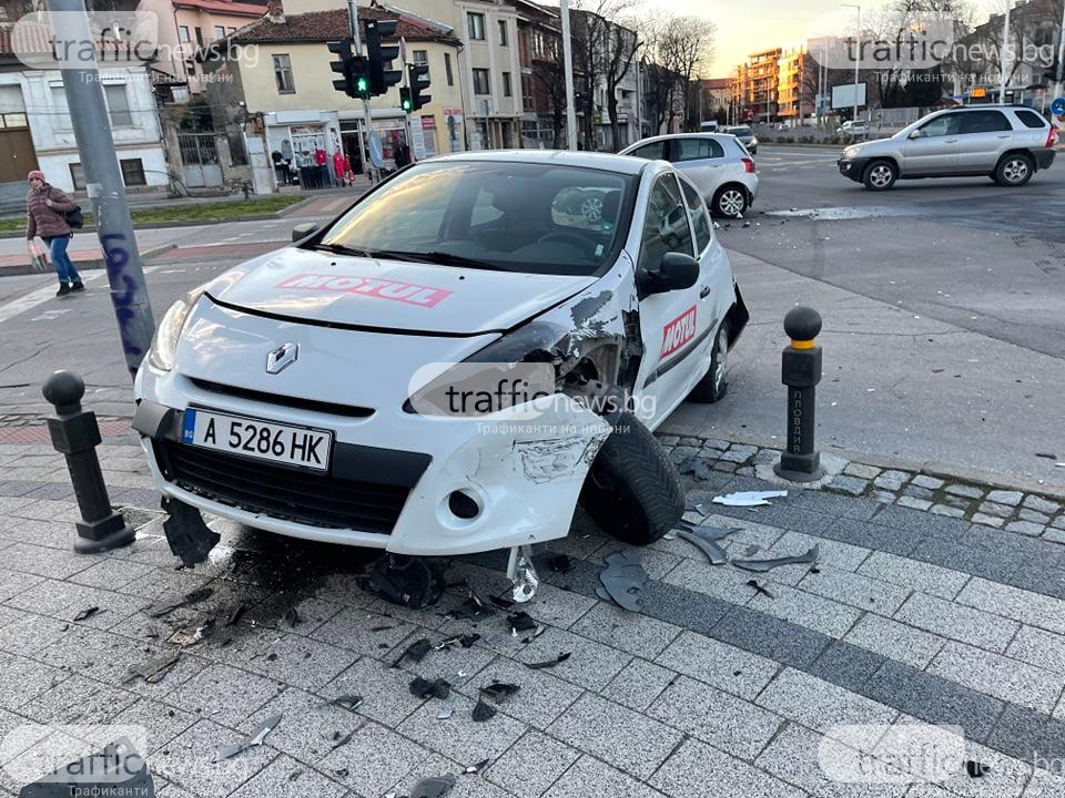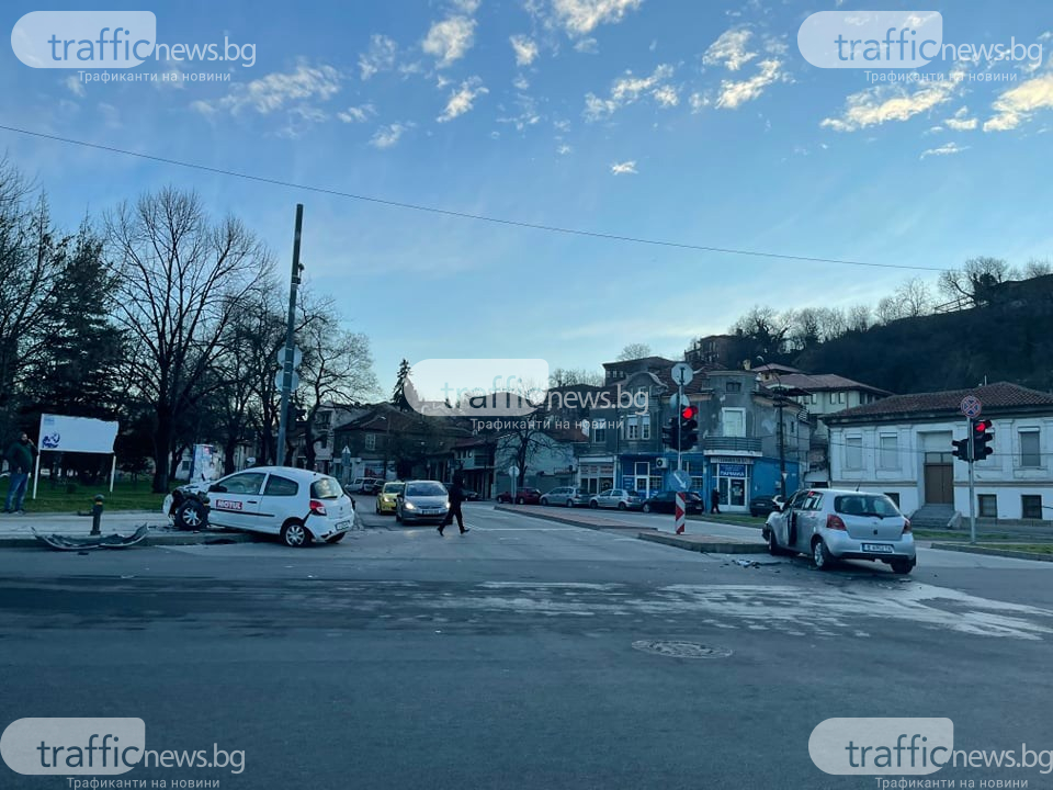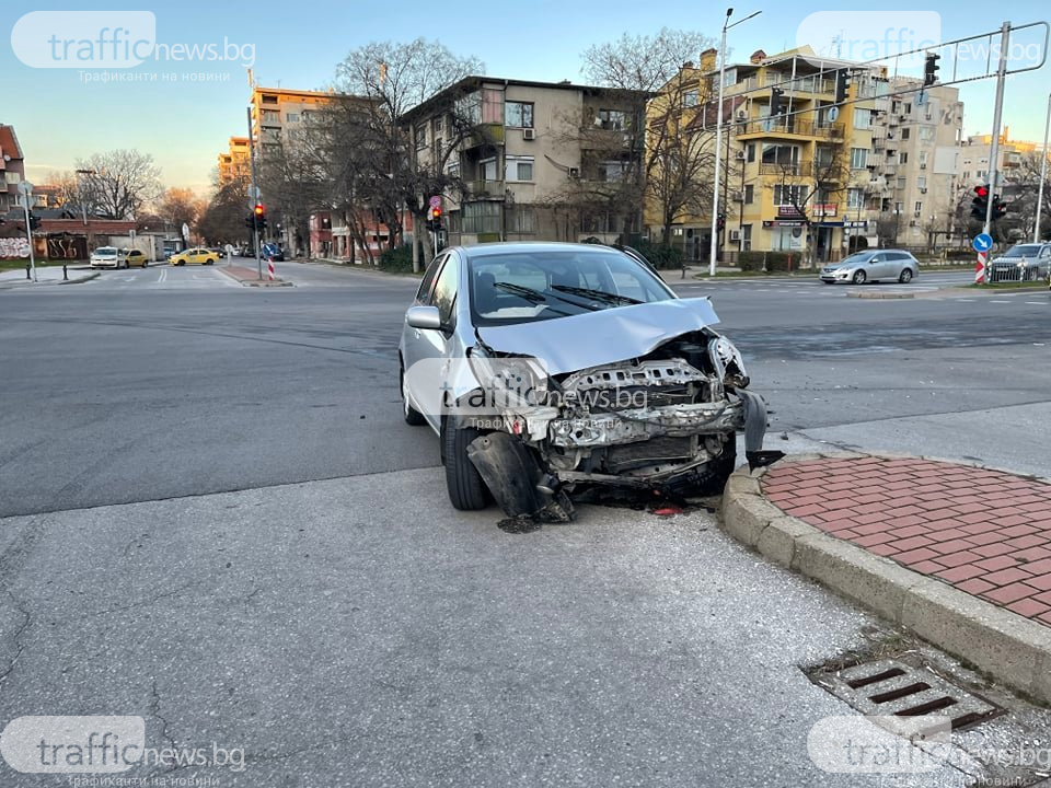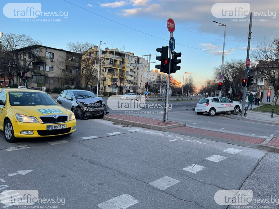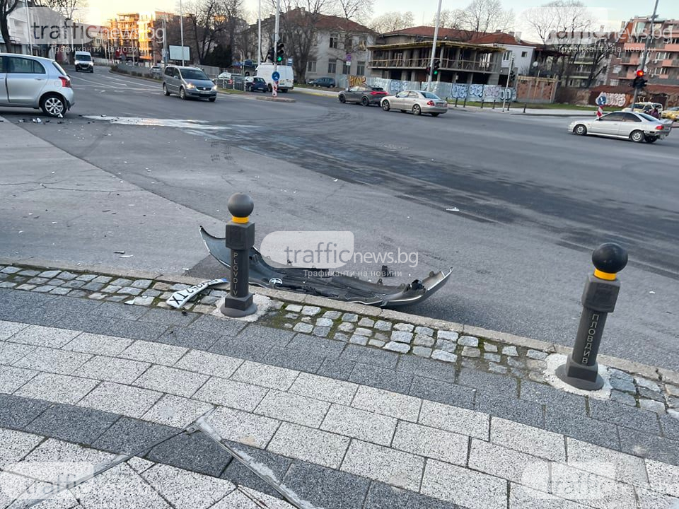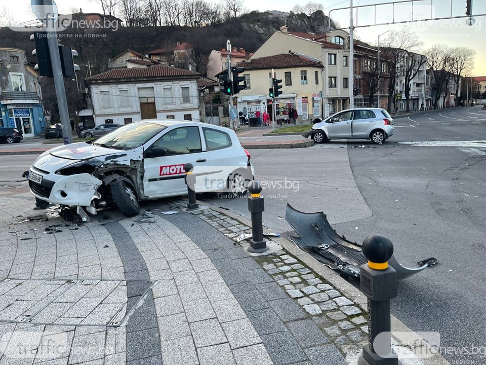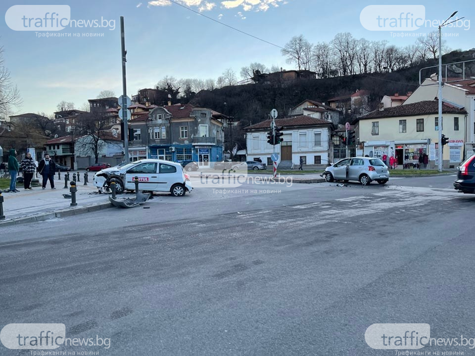 При челния удар едната кола се е покачила на тротоара, а другата на острова за пешеходци сред двете платна.