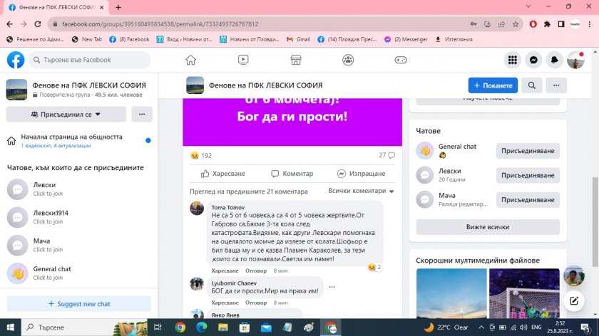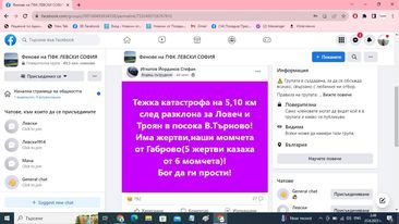 " Тежка злополука на 5-10 километра след разклона за Ловеч и Троян в посока Велико Търново! Има жертви, наши момчета от Габрово (5 жертви, споделиха от 6 момчета)! Бог да ги елементарни! ", написа в дребните часове на петъчния ден Игнатов Йорданов Стефан от Facebook групата " Фенове на ПФК ЛЕВСКИ СОФИЯ ".