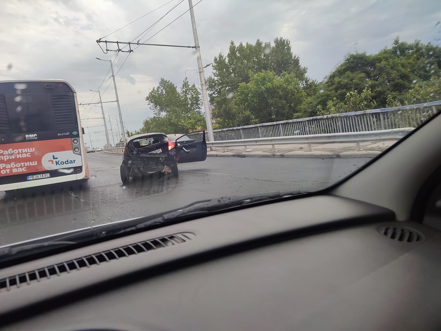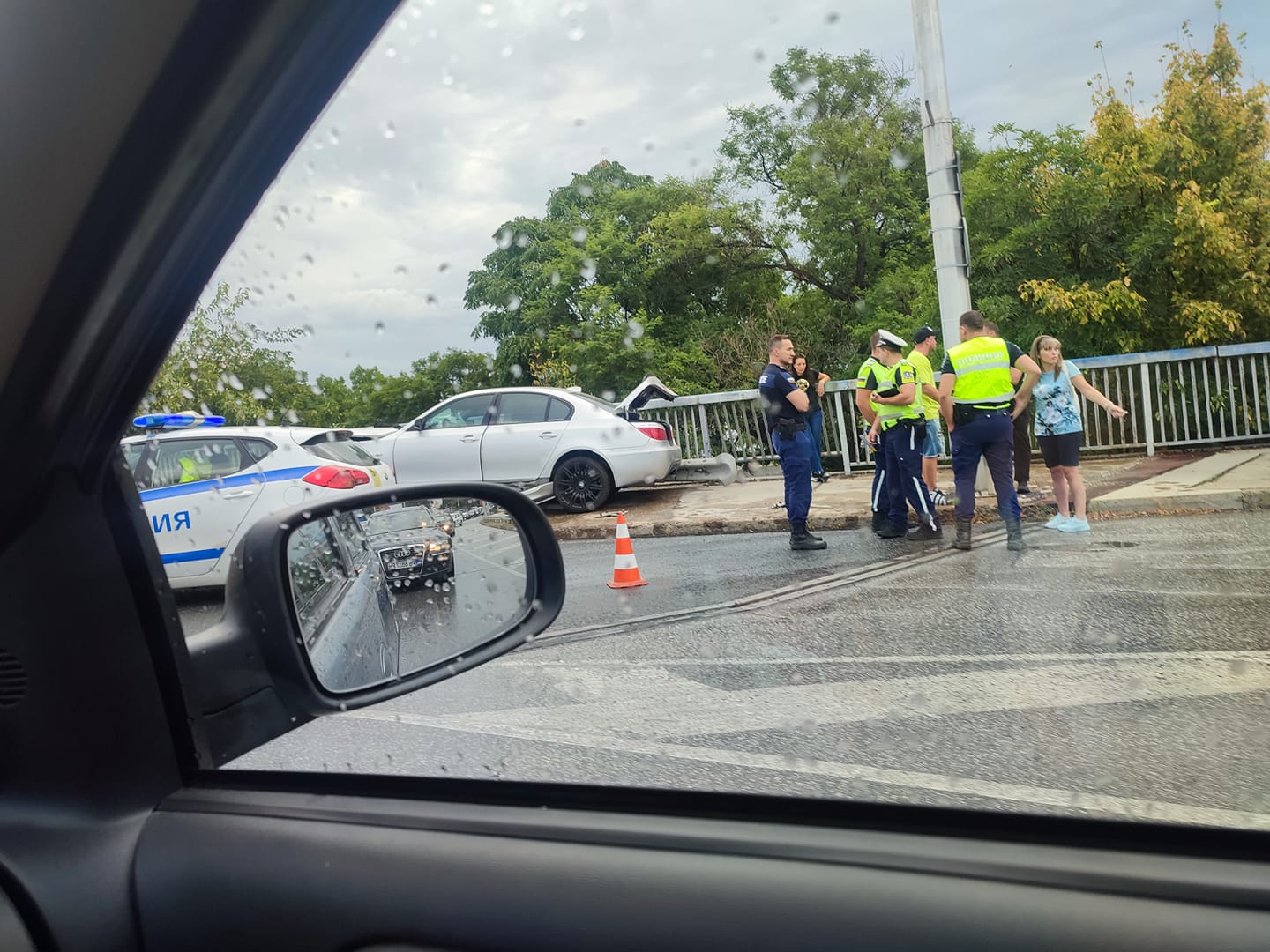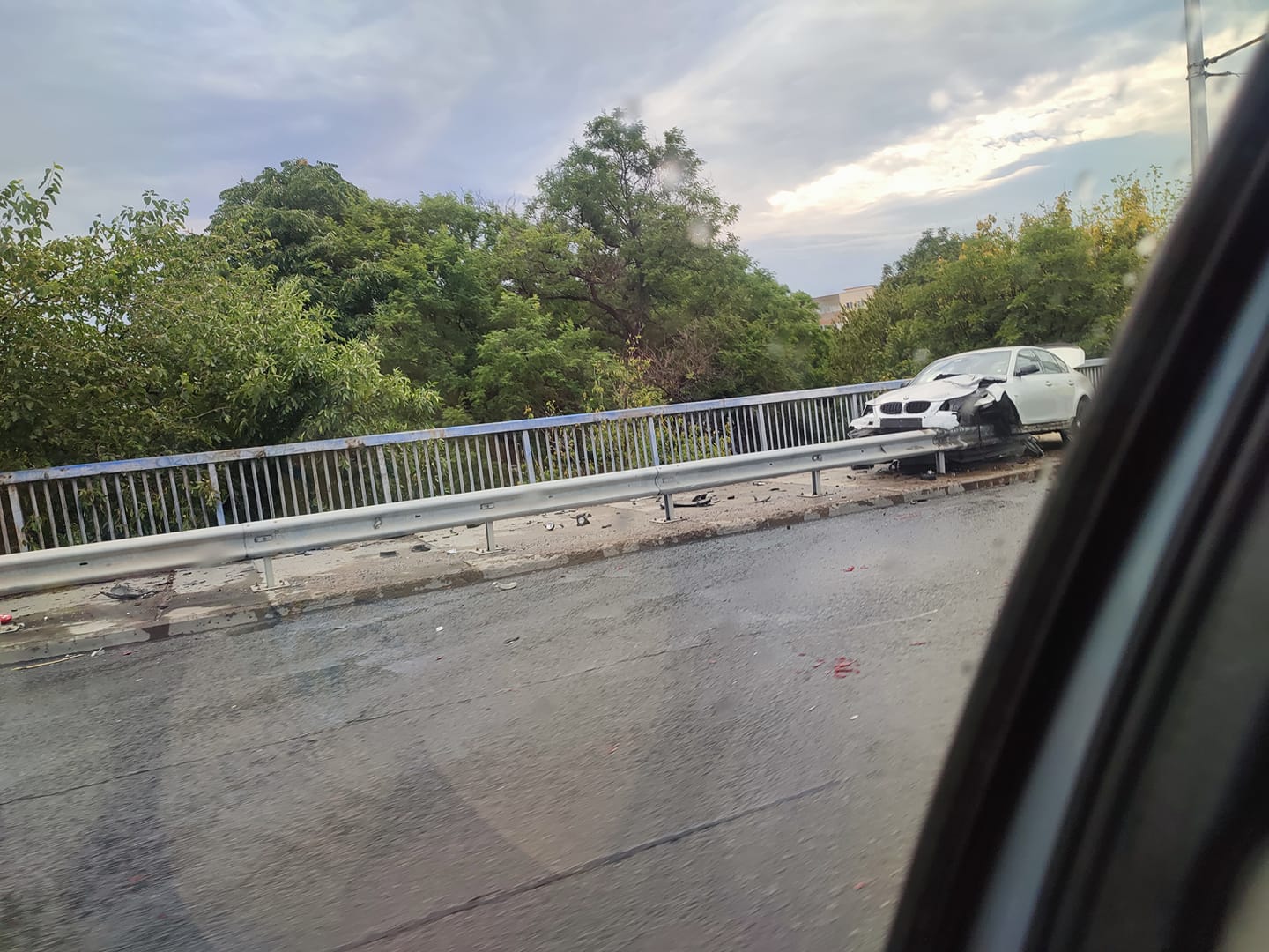 От фотоси, споделени в обществената мрежа Facebook, е видно, че лек автомобил с марката " BMW " е кацнал върху мантинелата. Друг автомобил, който е на платното за придвижване, е със смазана задна част.