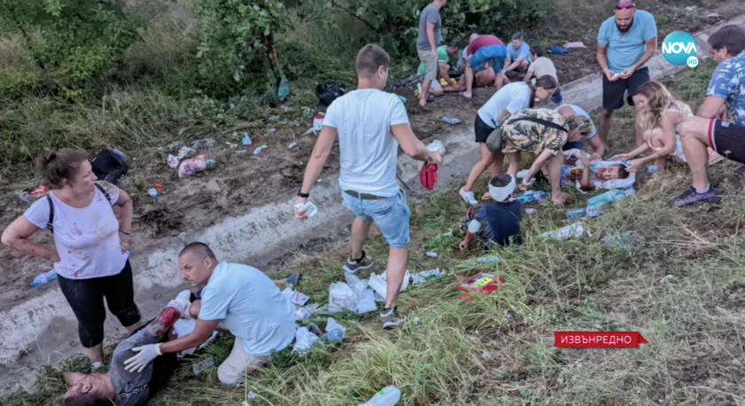 На място са пристигнали екипи на полицията, пожарната и Спешна помощ, а доста водачи са спрели и оказват помощ да бъдат извадени ранените от рейса.