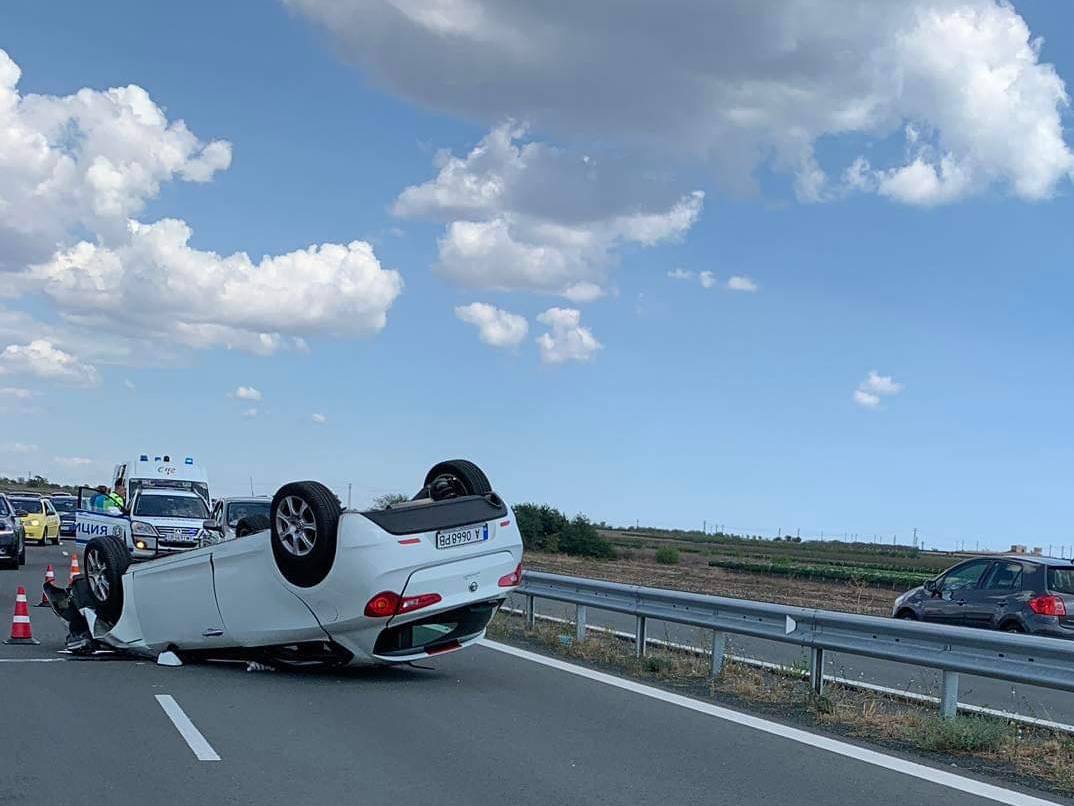 Лек автомобил е извърнат по таван след зрелищна каскада, а до колата има кола за спешна помощ, която оказва помощ на тежко потърпевш, заяви Флагман.