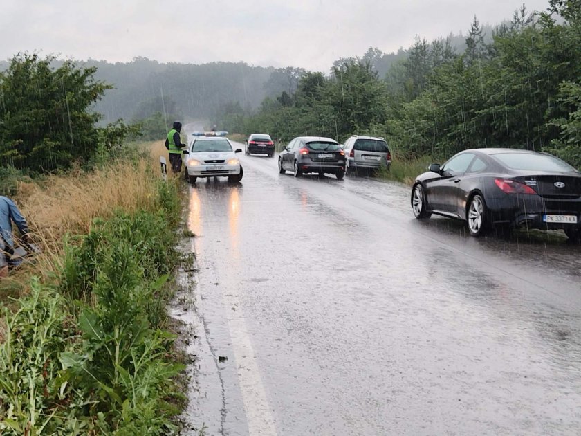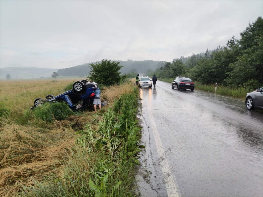 При злополуката са се сблъскали два леки автомобила, при което единият водач губи надзор на ръководството и се прекатурва по таван настрана от пътя.