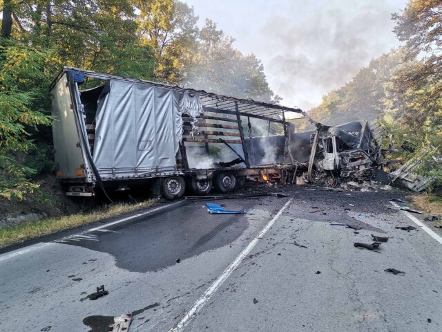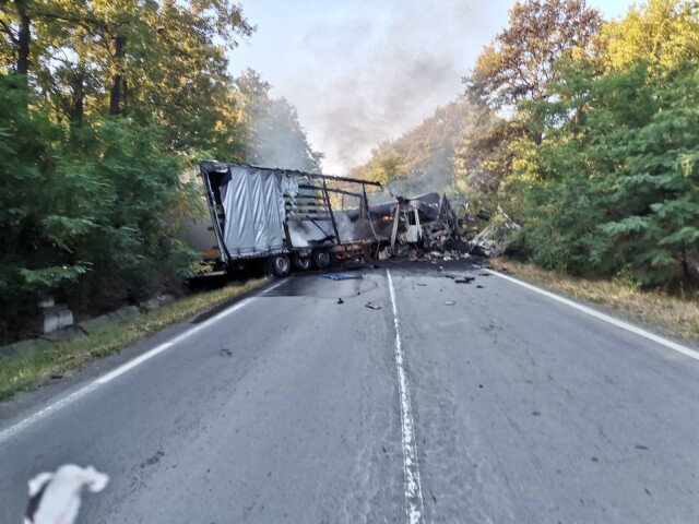 Инцидентът е станал в 5:48 ч. Вследствие на удара двата товарни автомобила са се самозапалили, оповестява кореспондентът на bTV в района.