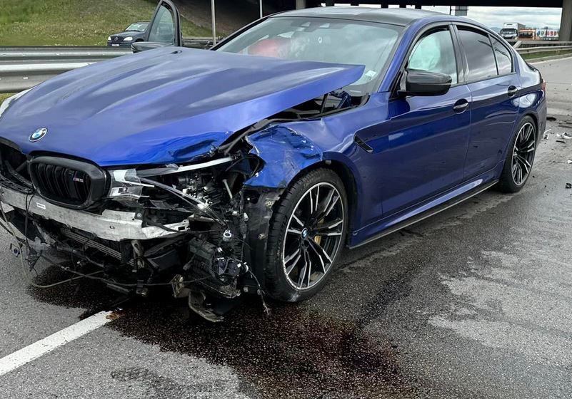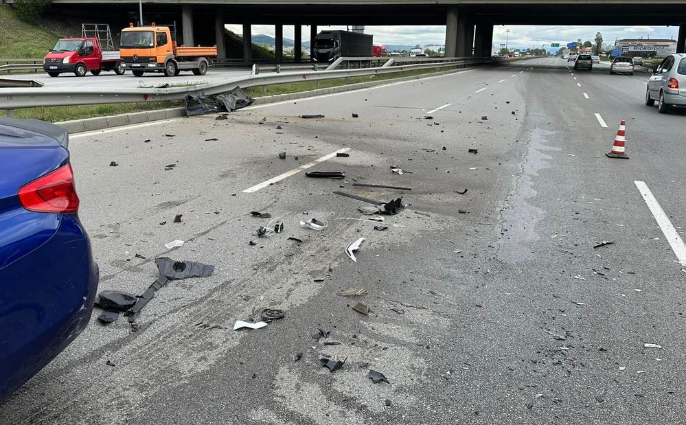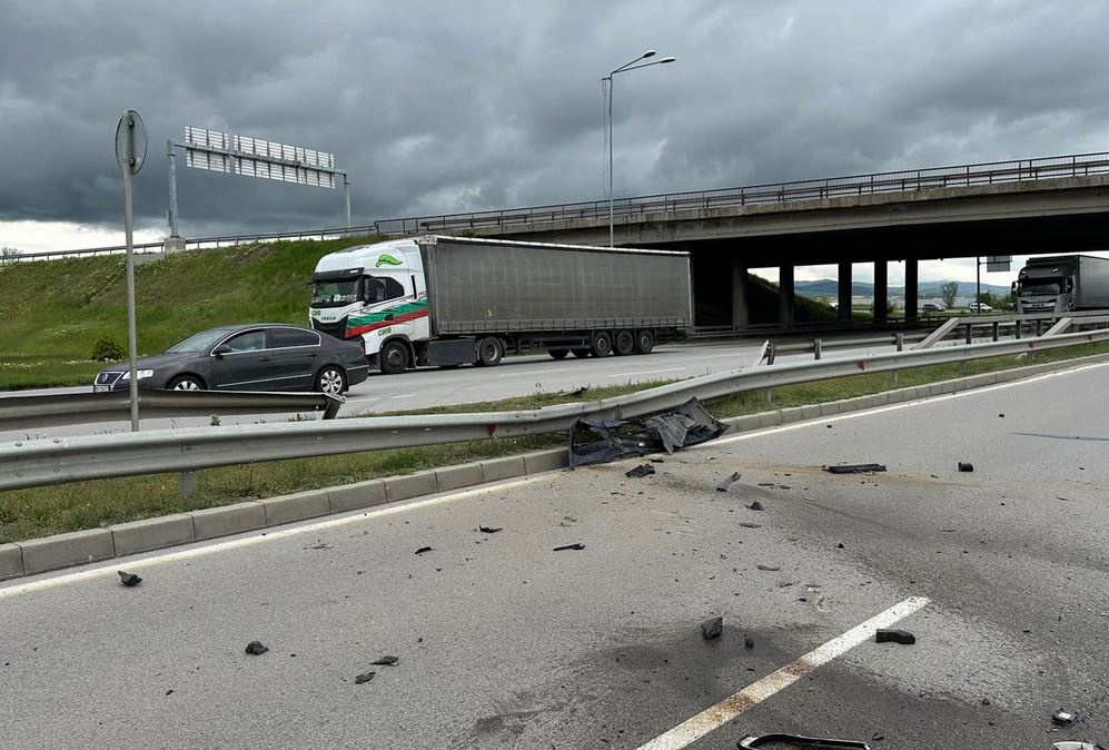 Машината е аварирала в междинната лента, по платното има изпочупени елементи. От силата на удара въздушните възглавници на колата са се отворили. Мантинелите в сектора са изкривени.