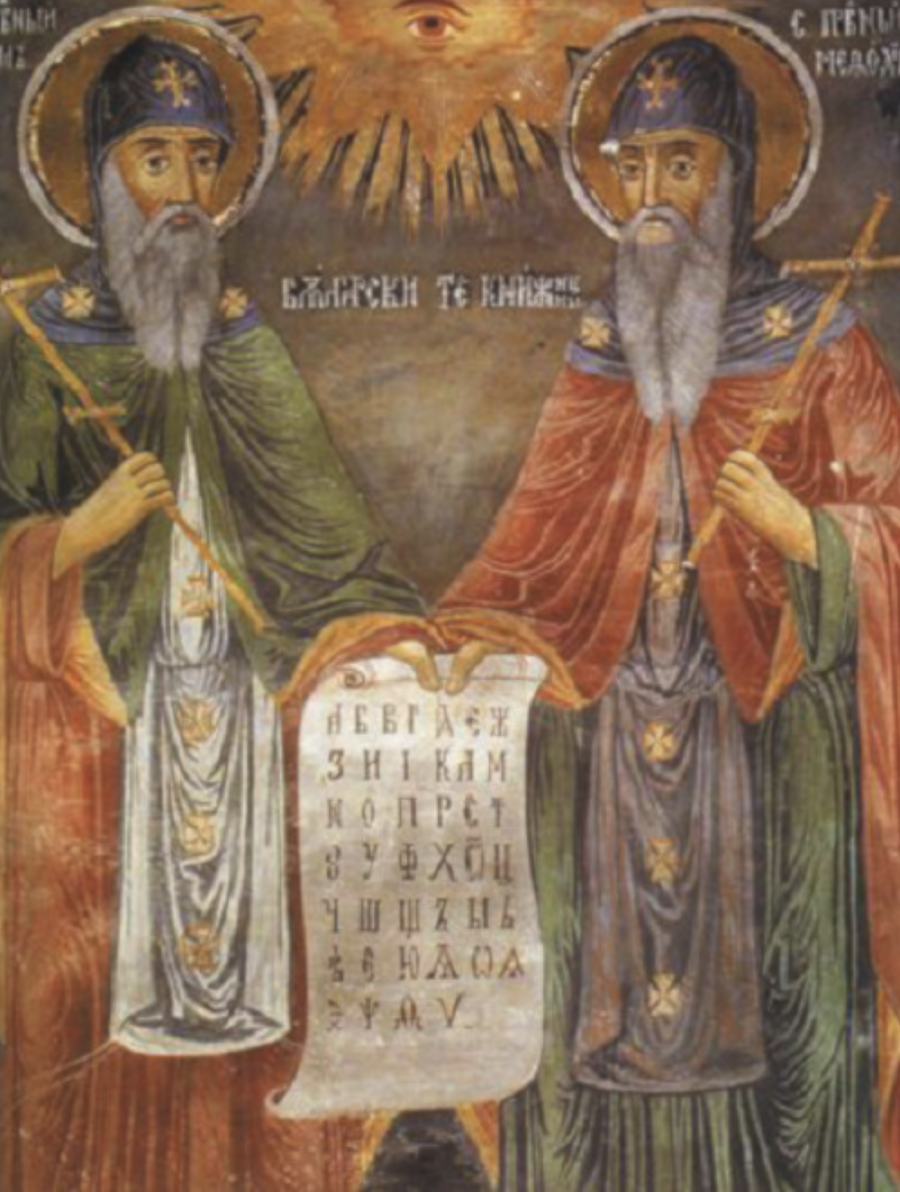 (Свети Кирил и Методий, стенна живопис от 1848 година от Захарий Зограф, Троянския манастир)