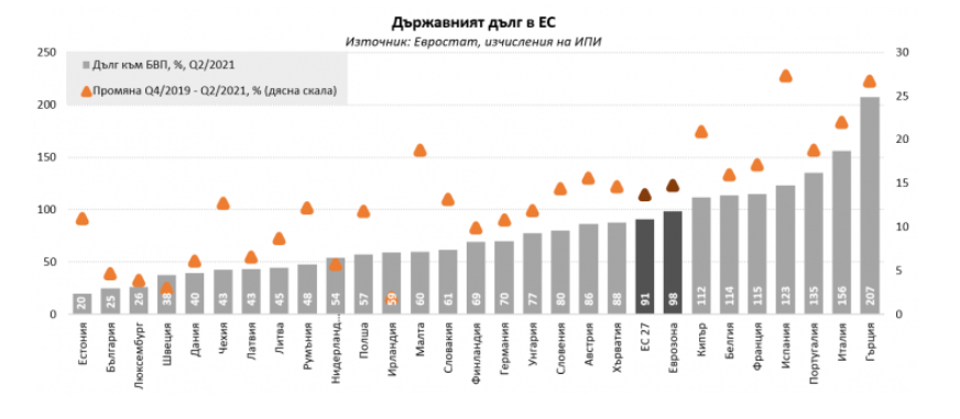 Влошаването на фискалната позиция в пандемията с прекосяването от остатъци към дефицити също беше относително лимитирано - повишаването на относителната тежест на дълга към размер на Брутният вътрешен продукт е с 4.7 процентни пункта в интервала от края на 2019 година до края на юни 2021 г.; единствено в три страни - Люксембург, Ирландия и Швеция - повишаването е по-малко.