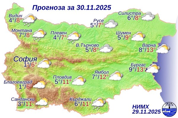 Минималните температури ще бъдат най-вече сред 1 и 6 градуса. В котловините на Западна България термометрите ще покажат до минус 2 градуса, а в София – към 1 градус.