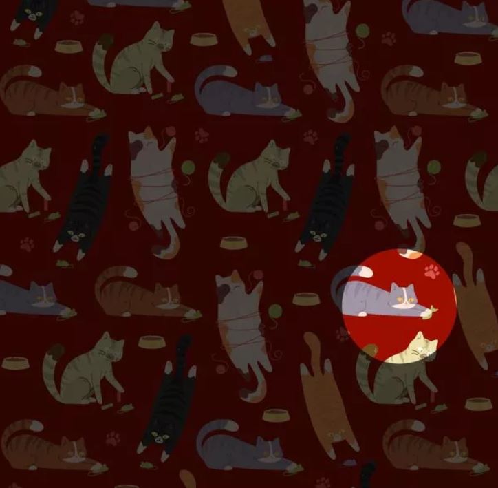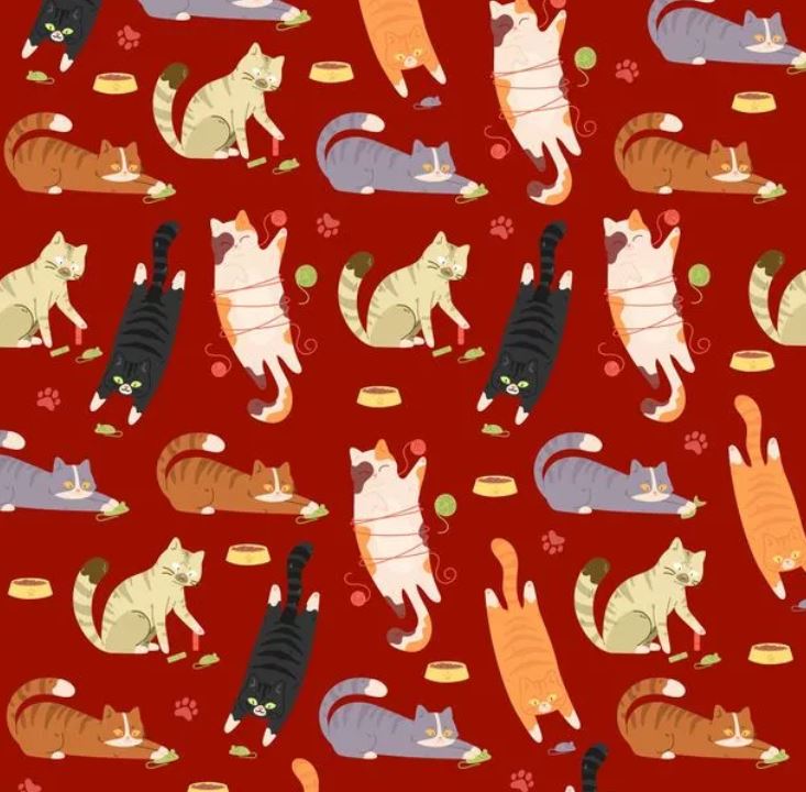 На картинката са изобразени група котки, които си играят с играчки.