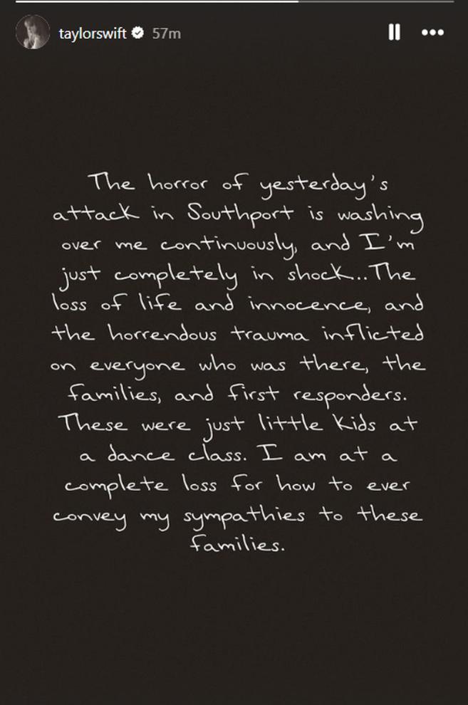 Суифт написа: „ Ужасът от вчерашното нахлуване в Саутпорт ме облива непрестанно и съм просто в цялостен потрес... Загубата на живот и непорочност, и ужасяващата контузия, нанесена на всички, които бяха там, фамилиите и първите пристигнали. "