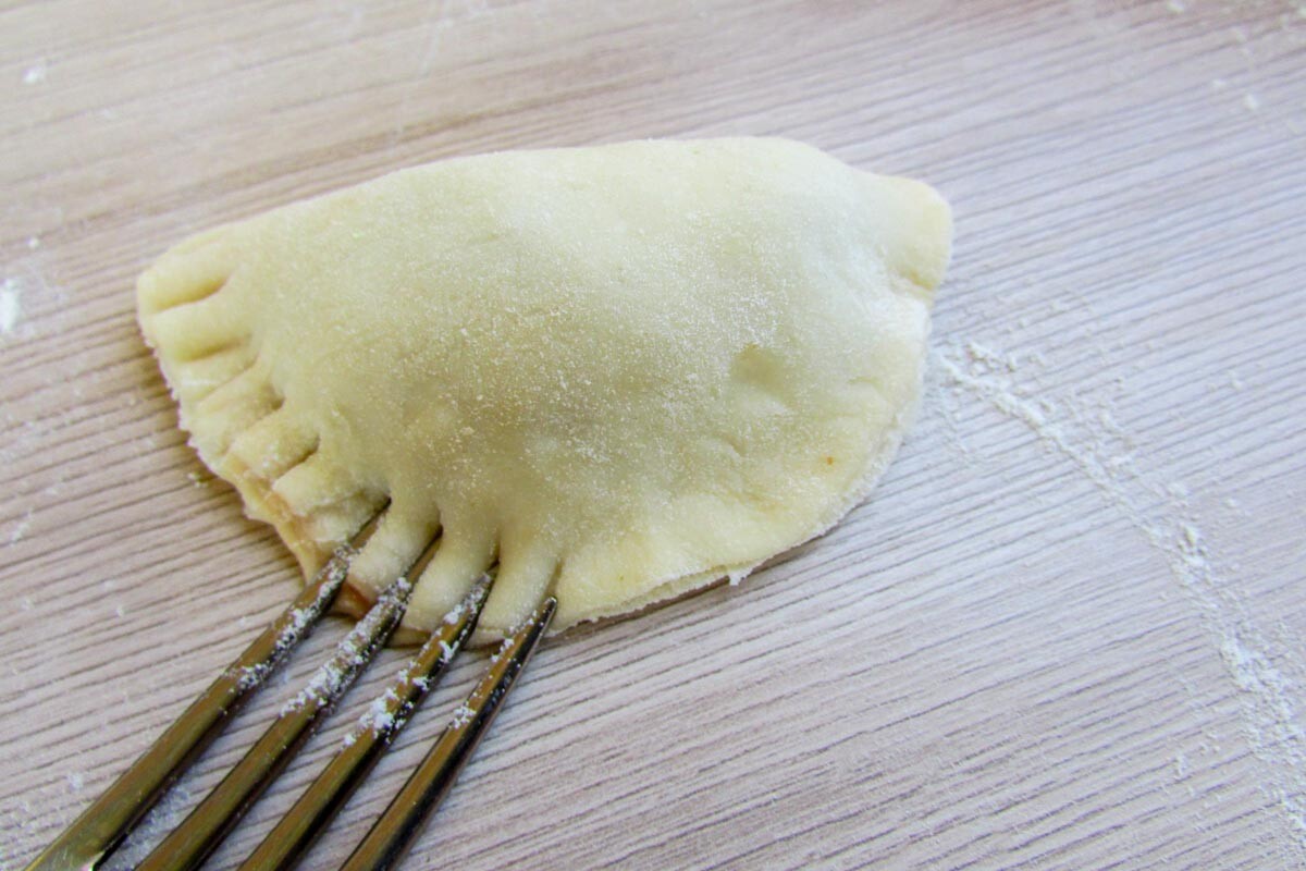 Сложете 1 с.л. от плънката върху половината от разточената питка, покрийте я с другата половина и защипете добре с вилица от едната страна, с цел да не изтече бульона по време на пърженето.