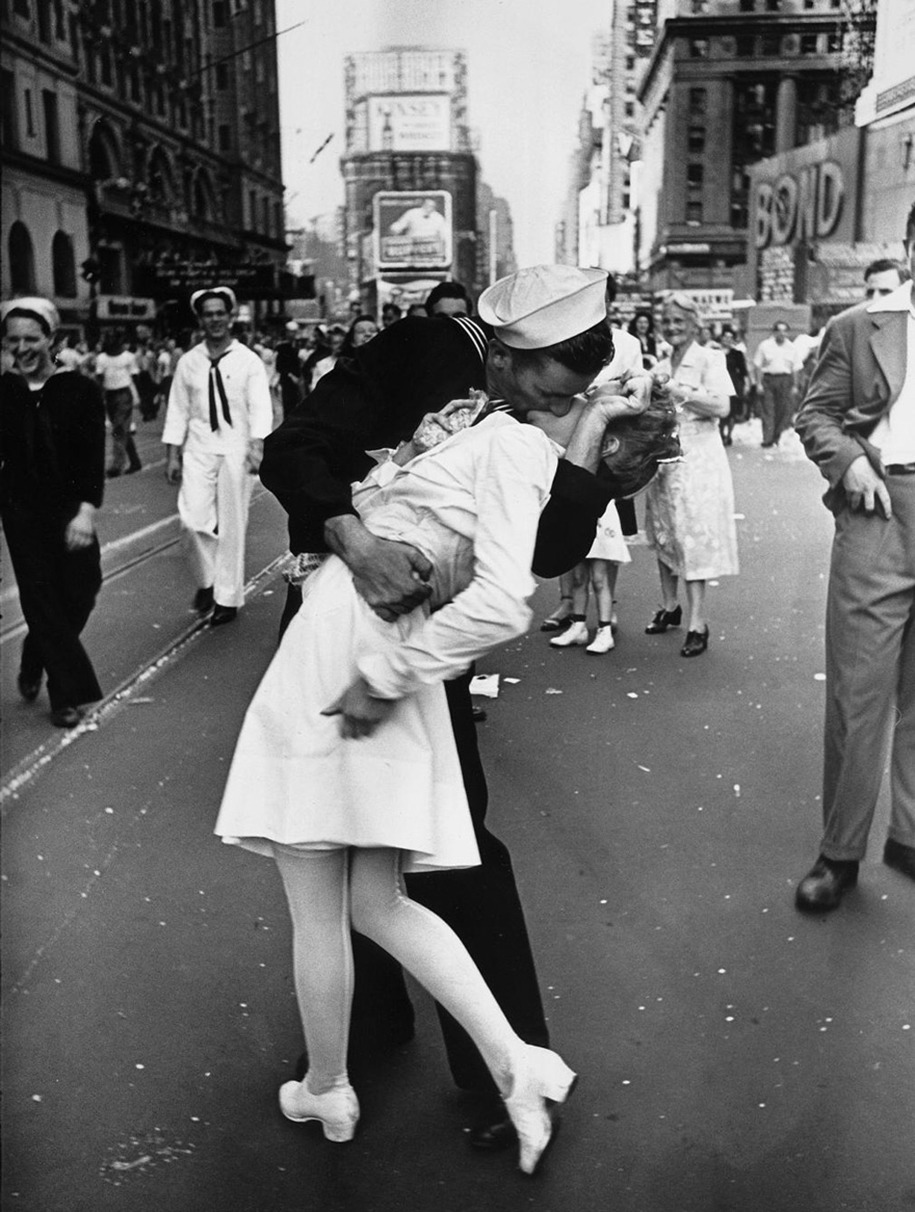 Тази емблематична фотография символизира края на Втората международна война, моряк целува здравна сестра на Таймс Скуеър, Ню Йорк, 1945