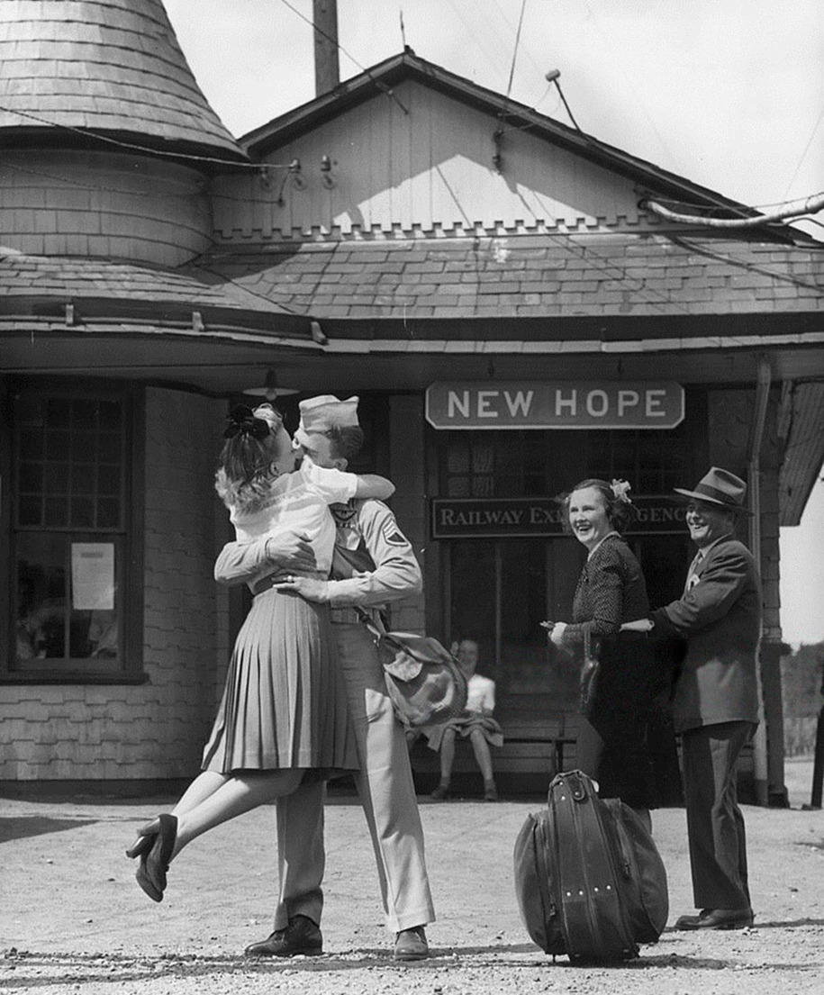Страстна прегръдка и целувка на жп гара, Кънектикът, 1945