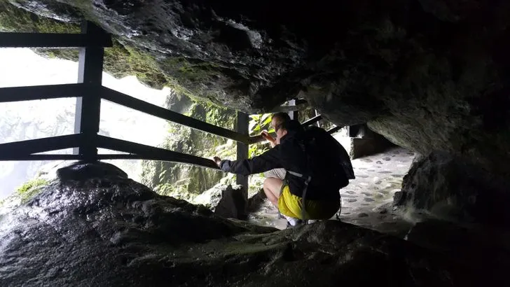 Стълбите минават през тунел с хлъзгави стени, който води право към водопада.