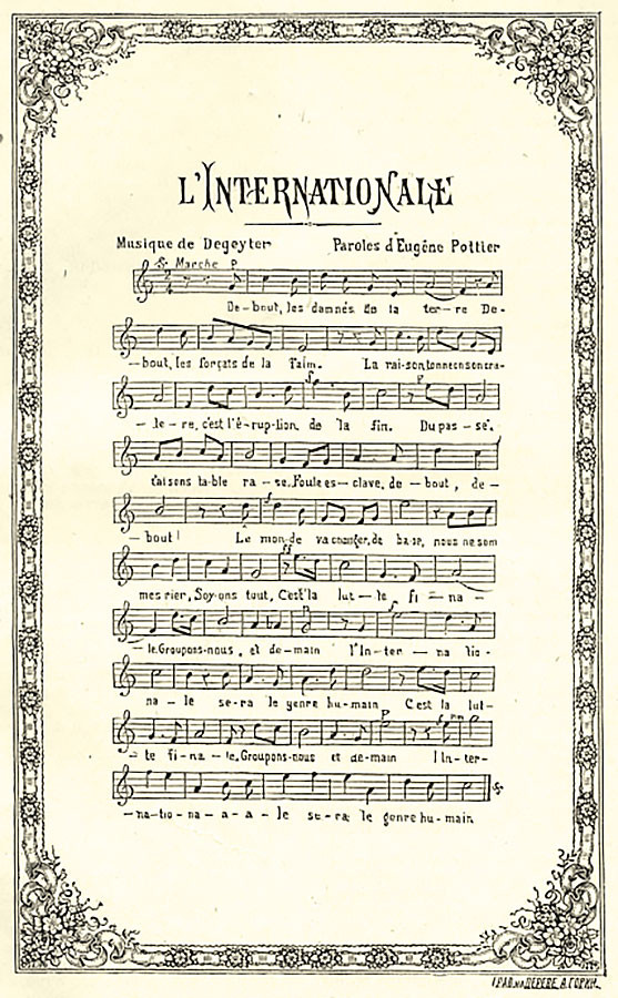 Текстът на „ Интернационала “ е написан от френския стихотворец и бунтовник Южен Един Потие (1816-1887) по времето на Парижката комуна – френското революционно държавно управление, което е просъществувало 72 дни. Първоначално текстът е изпят на мелодията на „ Марсилезата “, само че от 1888 година се употребява истинска музика, чийто създател е Пиер де Гейтер, белгийски служащ и композитор.
