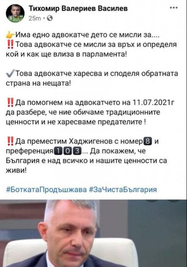 Тихомир Василев към Хаджигенов: Това адвокатче харесва и споделя противоположната страна на нещата Жесток скандал зрее в редиците на Мая Манолова и нейните „ Мутри “. Оказва се, че най-близките ѝ хора, които се водят лица на партията освен не могат да се понасят, само че и към този момент се атакуват обществено. Дясната ѝ ръка Тихомир Василев написа ожесточителен пост против юрист Николай Хаджигенов. „ Това адвокатче се мисли за връх и дефинира кой и по какъв начин ще влезе в Народното събрание “, написа Василев в собствен пост във фейсбук. По думите му Хаджигенов „ споделя противоположната страна на нещата “ и приканва почитателите на „ Мутрите “ да не гласоподават за него, тъй като те изповядвали обичайните полезности и го назовава изменник. Причината за раздора е коментар във фейсбук на Хаджигенов под пост за различен техен съмишленик Светослав Трайков. Самият Тракойв е бил в редиците на ГЕРБ и даже е опитал да влезе с тях в Народното събрание, само че не му се е получило. Според Хаджигенов, Трайков освен няма да успее на идния избор, само че и цялата им групировка водена от Мая Манолова. Скандалът в „ Мутрите “ се разстраства, като се вижда че почитателите на партията по никакъв начин не утвърждават Хаджигенов и воплите му в България да се признаят гейбраковете.