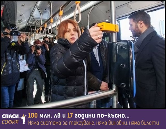 Целият този безпорядък издава същинското лице и благоприятни условия на дилетантите, които ръководят София. След профукани съвсем 100 млн. лева - задоволително пари за закупуването на 200 нови рейса, билет система няма. Не е ясно и дали таксуването ще е на време или на разстояние, нито пък за какво не са планувани автомати по основните спирки и в транспортните средства. Няма и едно опрощение и пояснение от Йорданка Фандъкова, за какво за следващ път се стигна до задънена улица, нито пък се знае по кое време и по какъв начин ще проработи системата.