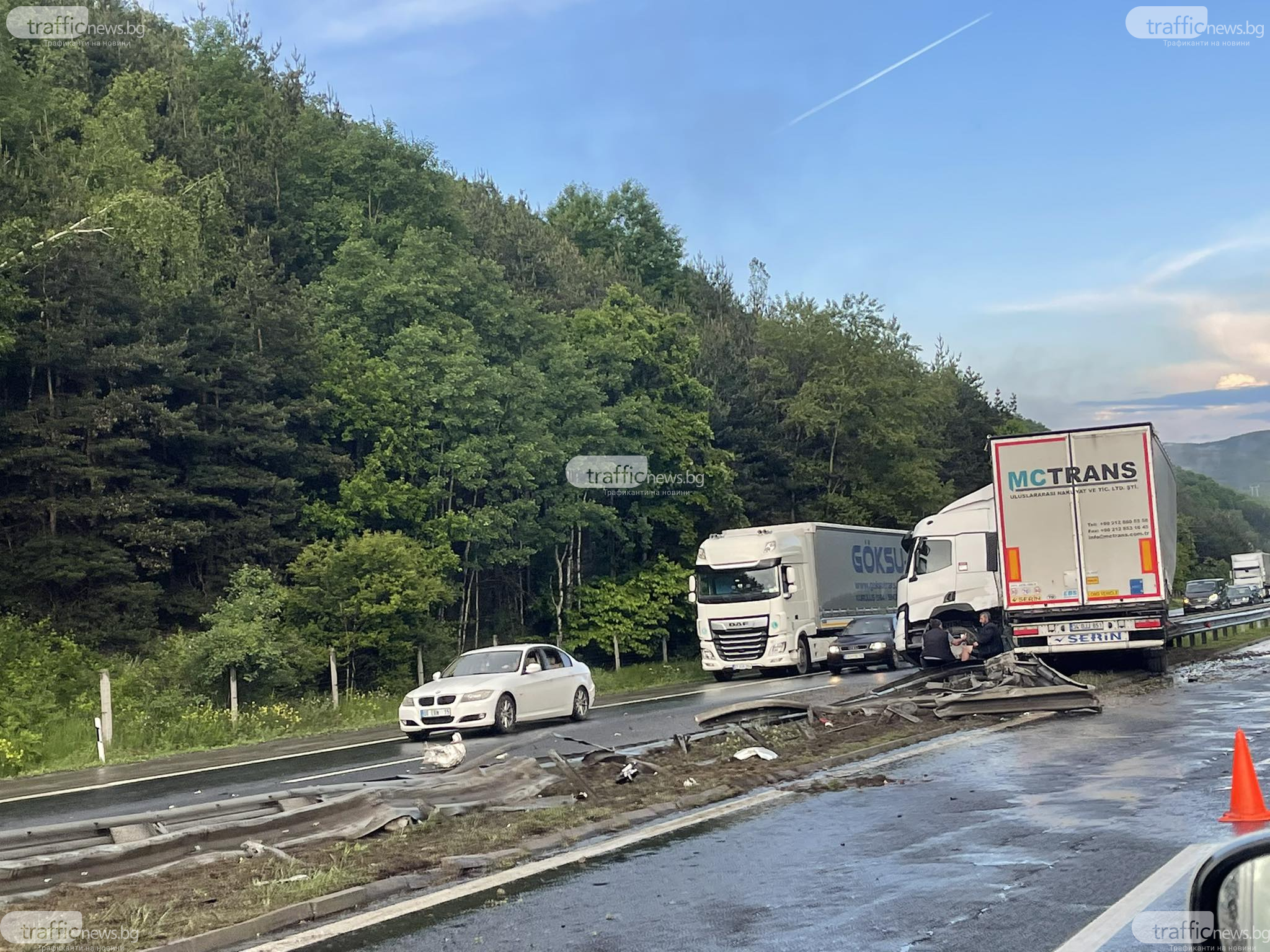 Тир е катастрофира на Автомагистрала „ Тракия. Тежкотоварният автомобил се е забил в мантинелата, като е навлязъл в отсрещното платно “, видя кореспондент на TrafficNews .
