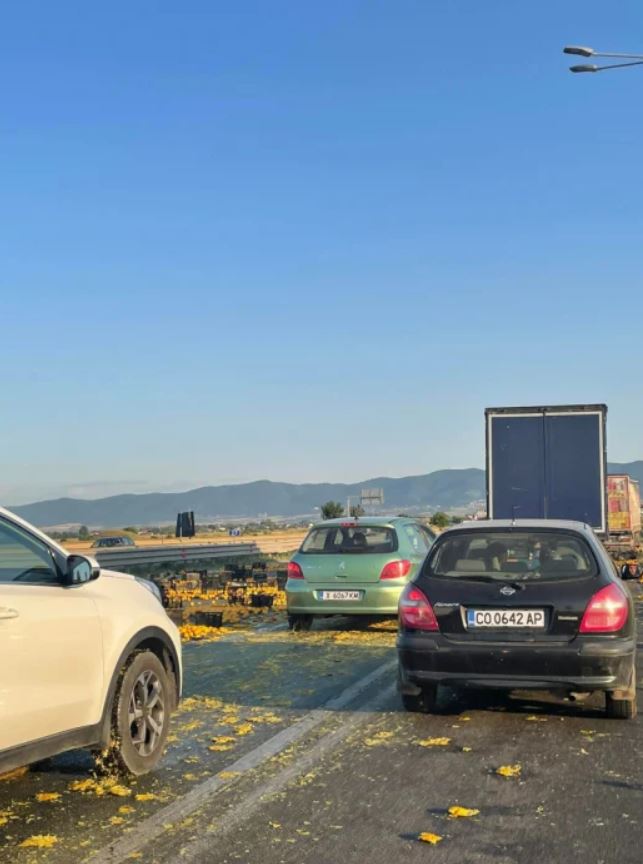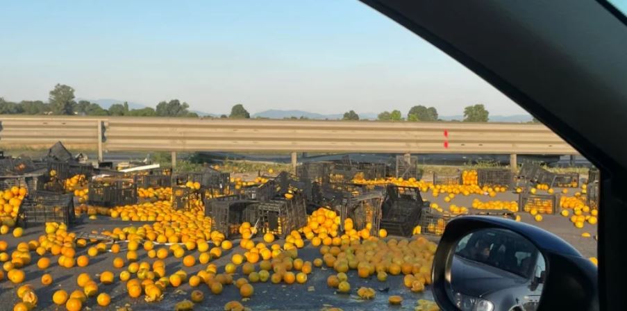 По думите на очевидци целият товар, който се състои от портокали, е на шосето.