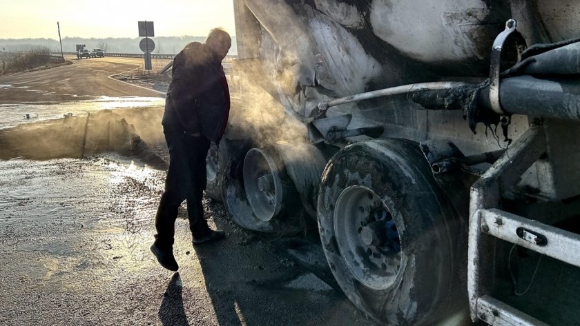 Шофьорът на тежкотоварния камион показа, че е гръмнала задната гума. От искрите се е запалило ремаркето, което транспортира цимент. Той незабавно е отбил на паркинг.